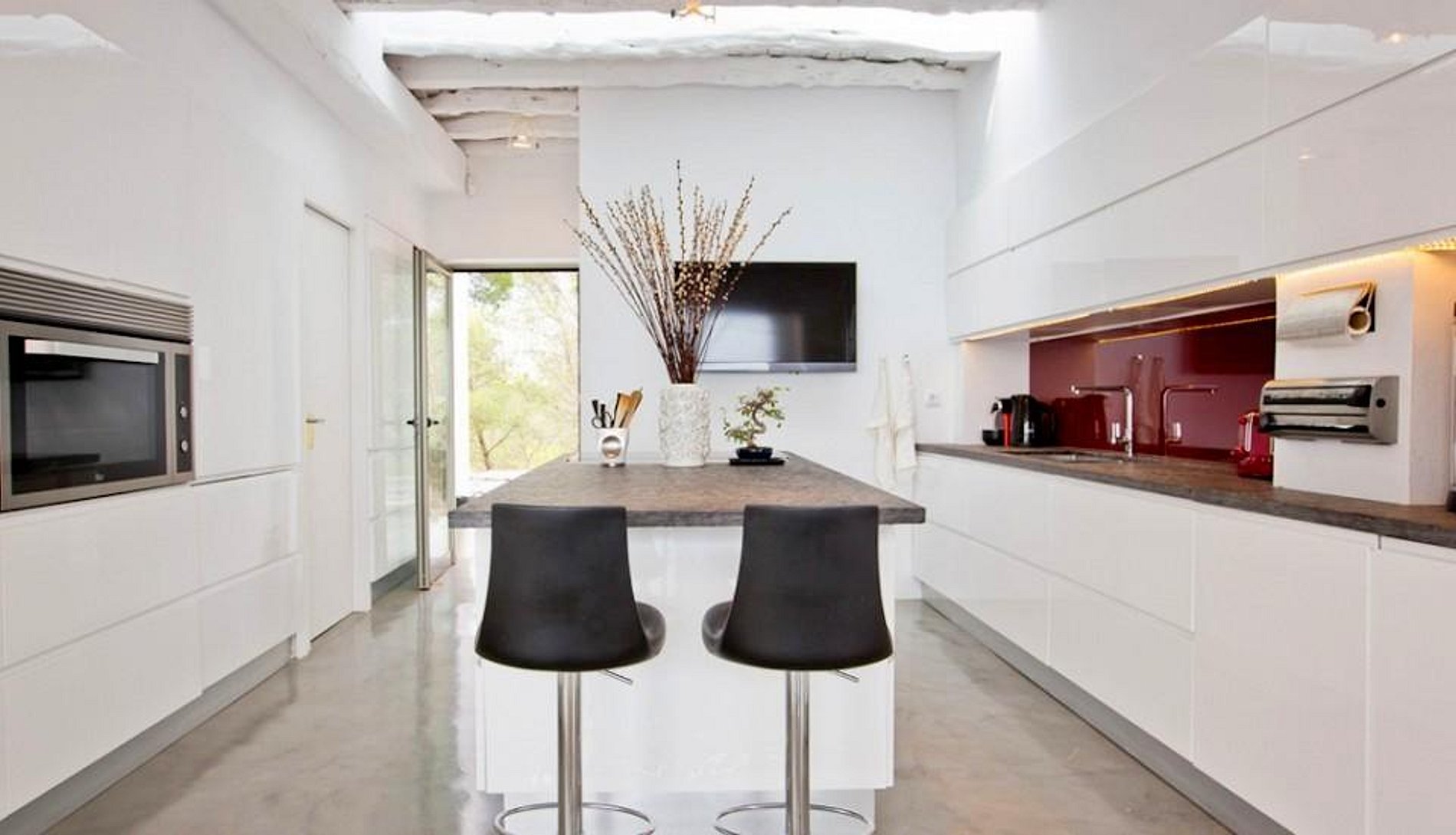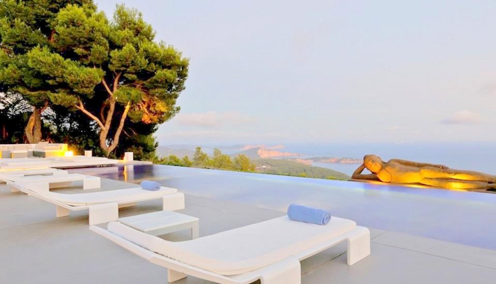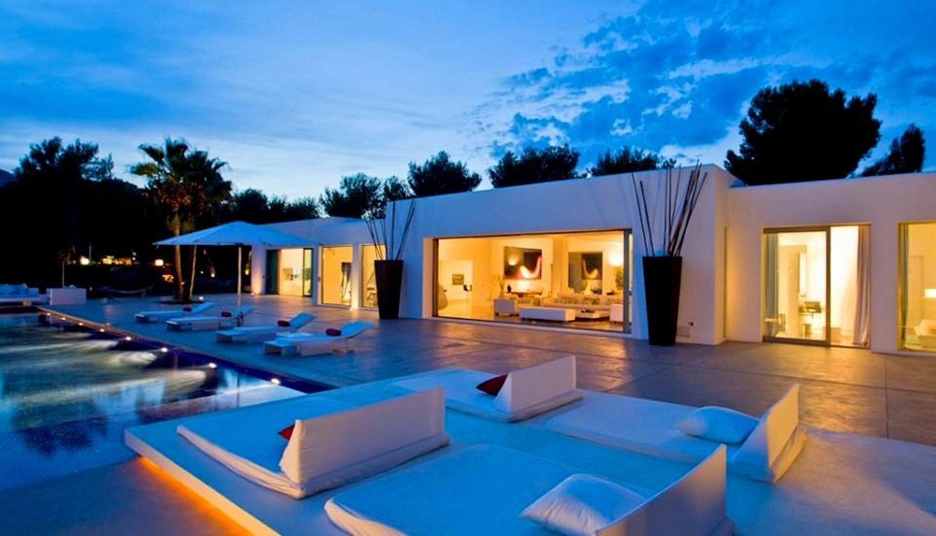 Casa Luxo Ibiza tem vistas deslumbrantes sobre o Mar Mediterrâneo. Em Ibiza são certamente o cartão de visita dessa vila. Com uma arquitetura moderna, a casa possui em toda sua extensão muito design e um mobiliário contemporâneo. Luxo, tranquilidade e conforto estão bem alinhados aqui. Casa Luxo Ibiza fica no alto, acima do mar, não muito longe de Es Cubells, rodeado por árvores e folhagens, com vistas panorâmicas sobre as colinas e, claro, o mar azul … Azul que se estende até o horizonte. Uma piscina infinita sugere uma ilusão de água com o mar e o céu, com amplas espreguiçadeiras que rodeiam a piscina. Uma área de jantar ao ar livre no terraço, um terraço coberto e áreas de estar que oferecem conforto para relaxar ao ar livre. O interior da casa estende-se a 550 metros quadrados..