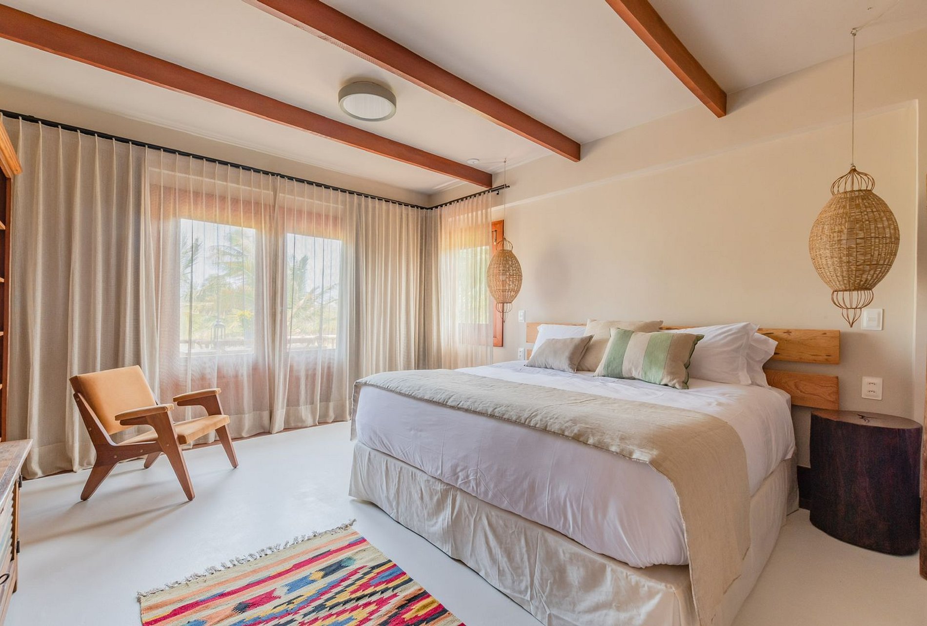 A casa possui 5 suítes e cada uma delas foi projetada para proporcionar conforto, equipadas com mobiliário de design, roupas de cama 600 fios, travesseiros de pluma, ar-condicionado, toalhas gigantes trousseau, amenities de banho, secador de cabelo e caixa de som alexa.