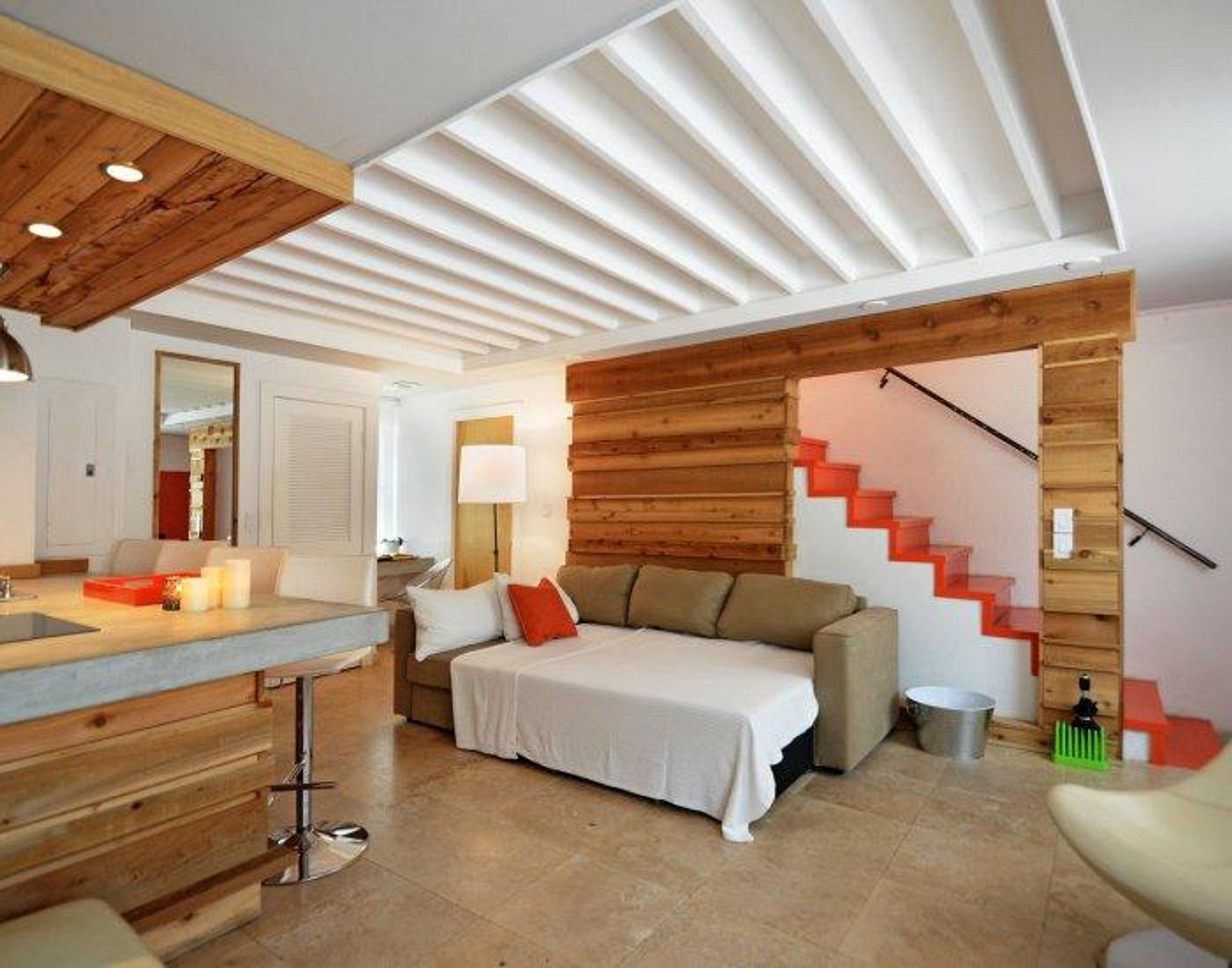 Ao entrar, você encontrará uma sala de estar de decorada de maneira inteligente e uma cozinha com decoração com uma mistura de painéis de madeira e paredes brancas, dando ao espaço uma sensação acolhedora e moderna. O sofá funciona como uma confortável cama queen-size com um lavabo no piso térreo - uma ótima opção, se você tiver visitantes passando a noite. Siga as escadas até o espaçoso quarto principal que possui um atraente chuveiro.