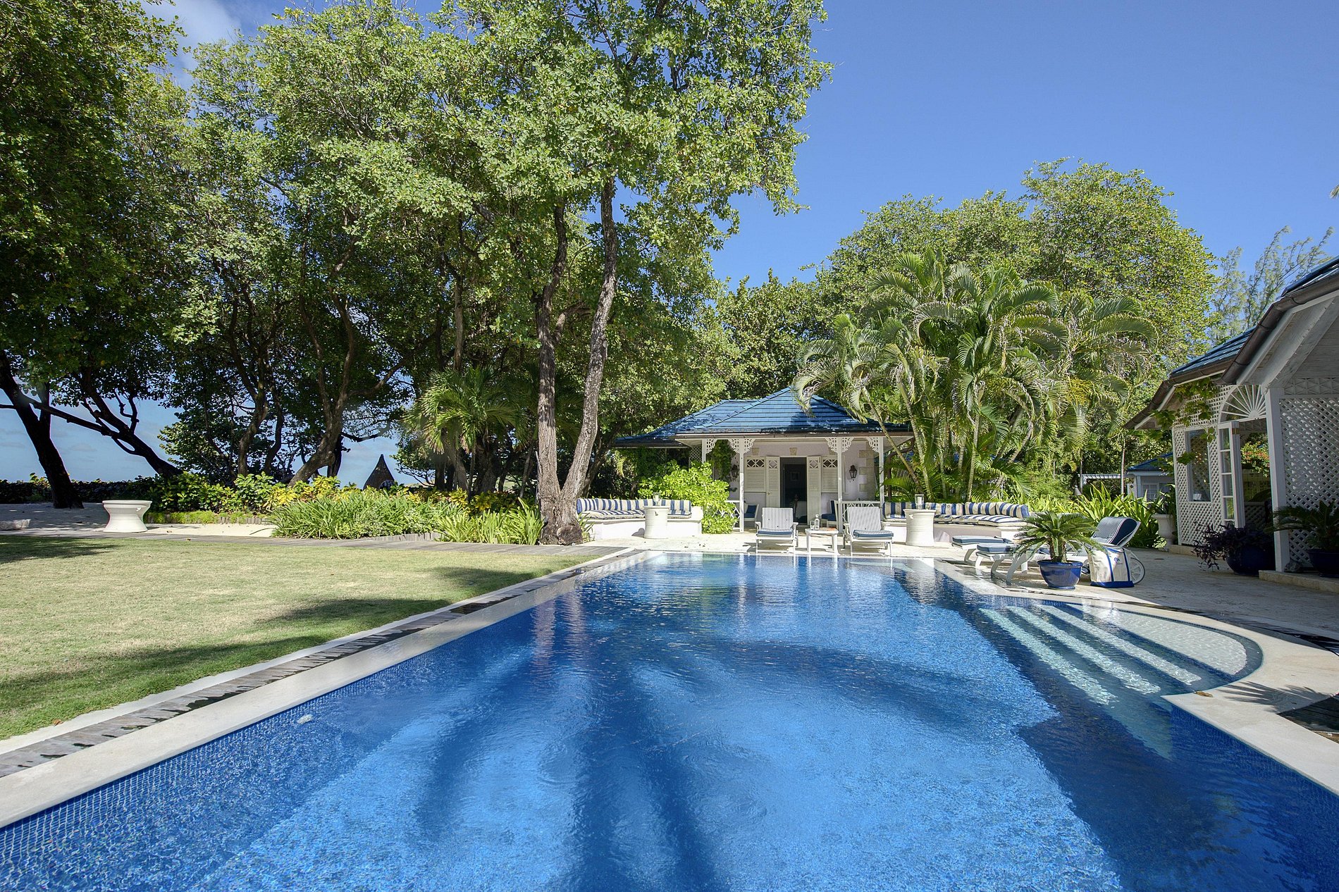 A Casa Principal possui uma sala de estar central onde se vê de um lado uma vista da fonte de água do pátio deslumbrante e do outro lado a área da piscina e uma extensão de 450 pés de praias de areia branca e do Oceano Atlântico. Uma generosa sala de jantar para 12 pessoas e um gazebo ao ar livre acomoda 9 convidados.