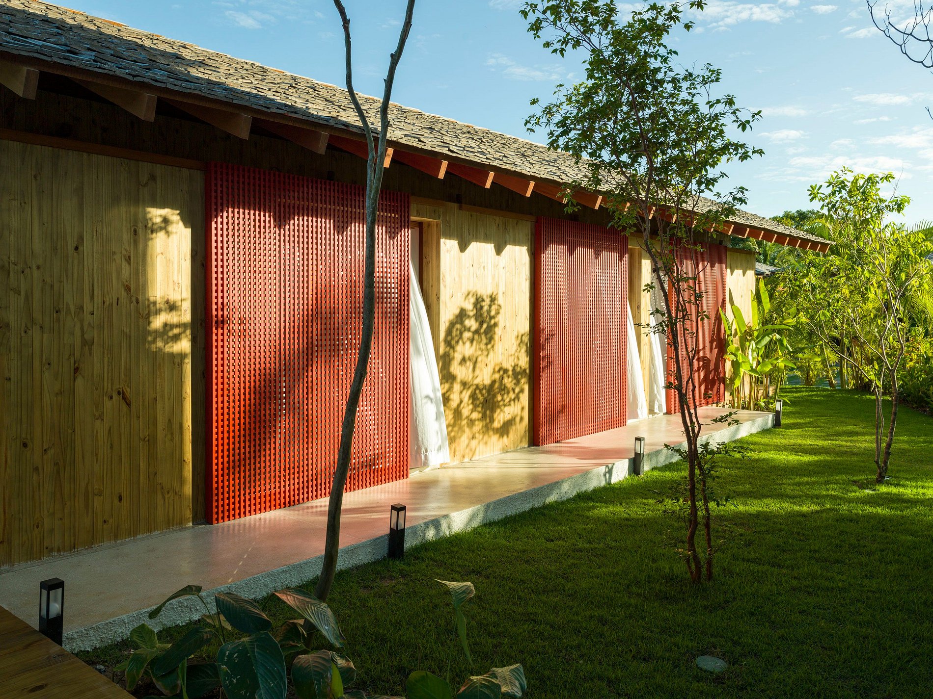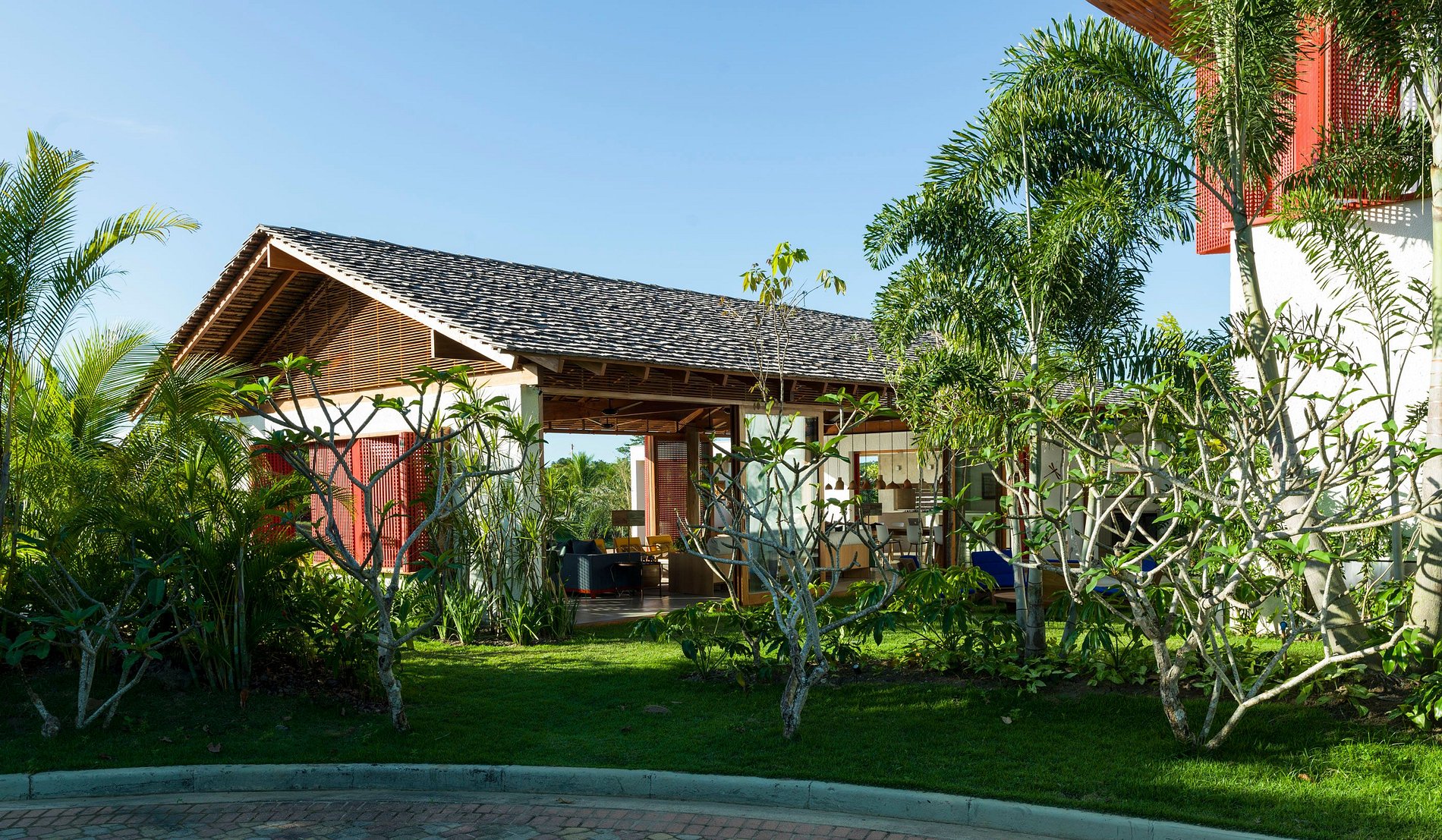 Com redes para descanso, piscina com espreguiçadeiras dispostas ao longo do elegante deck em madeira, sofás, e um charmoso pergolado. A sua área externa é adornada com belos jardins e espaços de convivência ao ar livre para relaxar sob o céu estrelado de Trancoso.