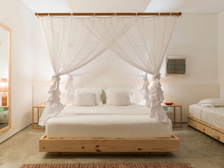 Suíte 6 – 1 cama de casal king size, mosquiteiro, ar condicionado.