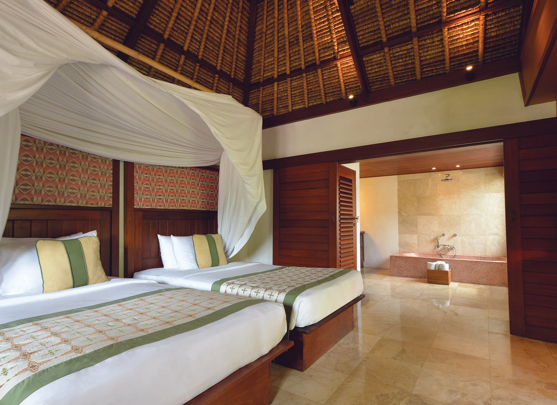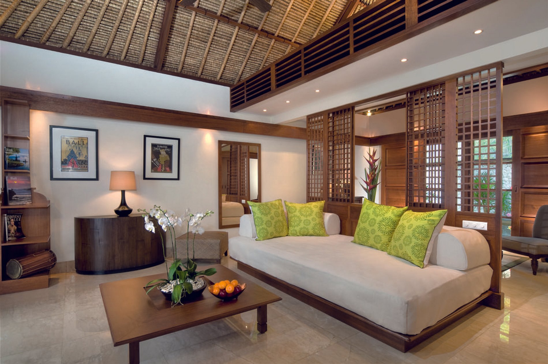 Pisos frios de mármore e móveis de teca decoram a espaçosa área de estar. Um sistema de entretenimento de alta tecnologia combina sutilmente com a arte tradicional balinesa. Deitar-se na cama oversized e olhar para a piscina azul.