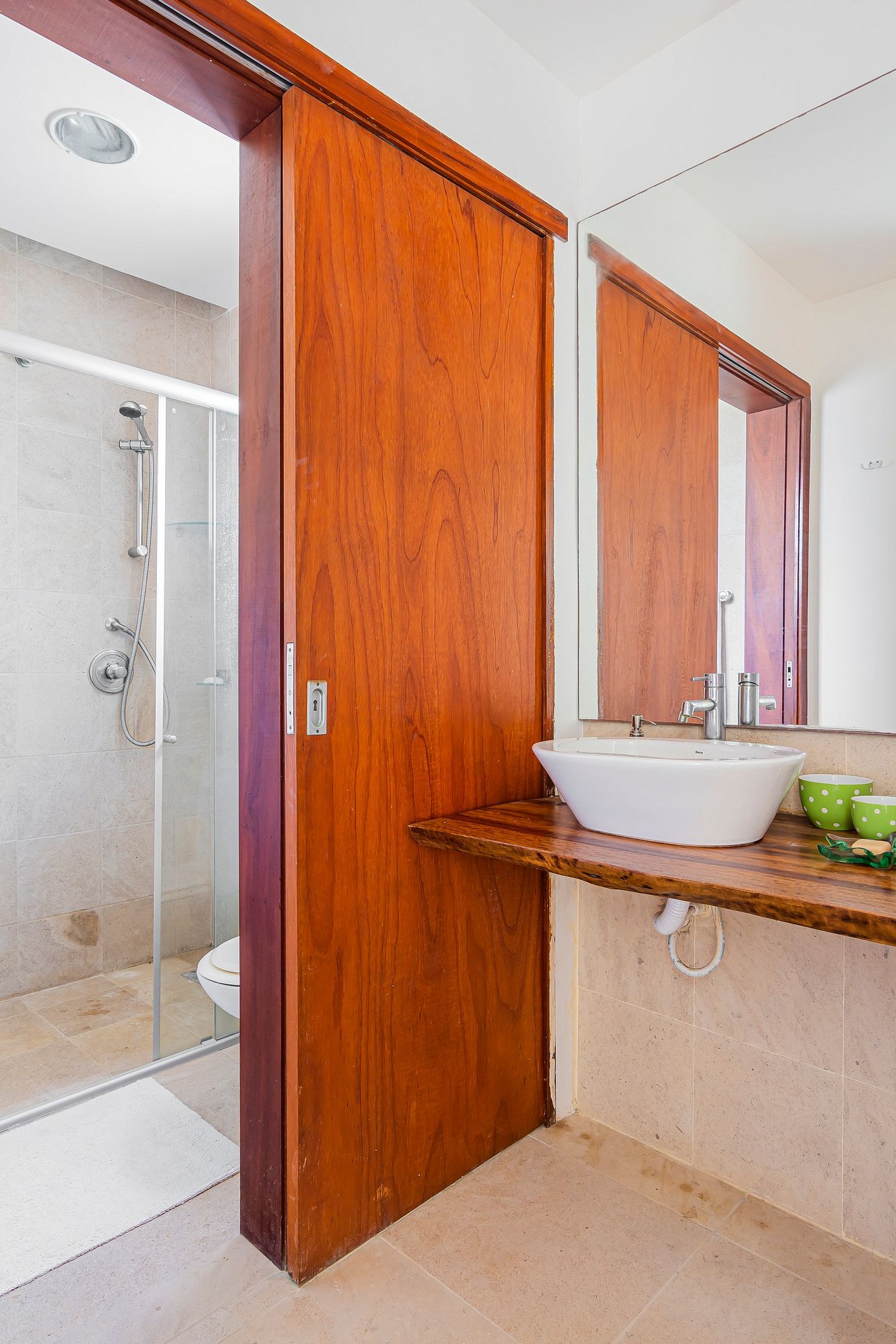 Suíte 3 - Cama king size, banheiro com chuveiro externo com vista para o mar e para o jardim do pátio interno;
