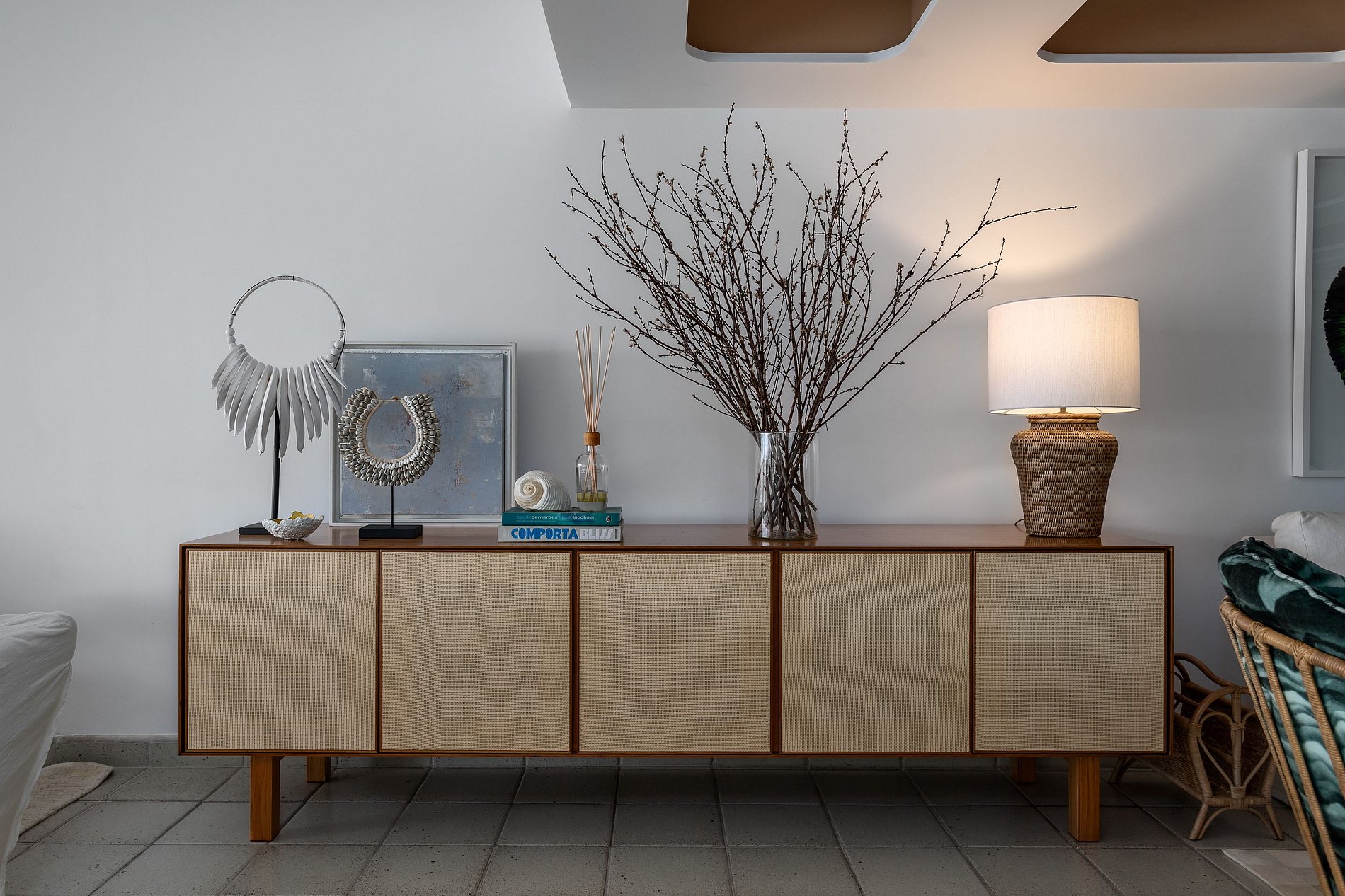 Com projeto da arquiteta Paloma Yamagata, a casa principal possui 4 suítes, mezanino, salas de estar, jantar, lounge e academia, além de oferecer 1 bangalô de hóspedes com 2 quartos e 1 banheiro.