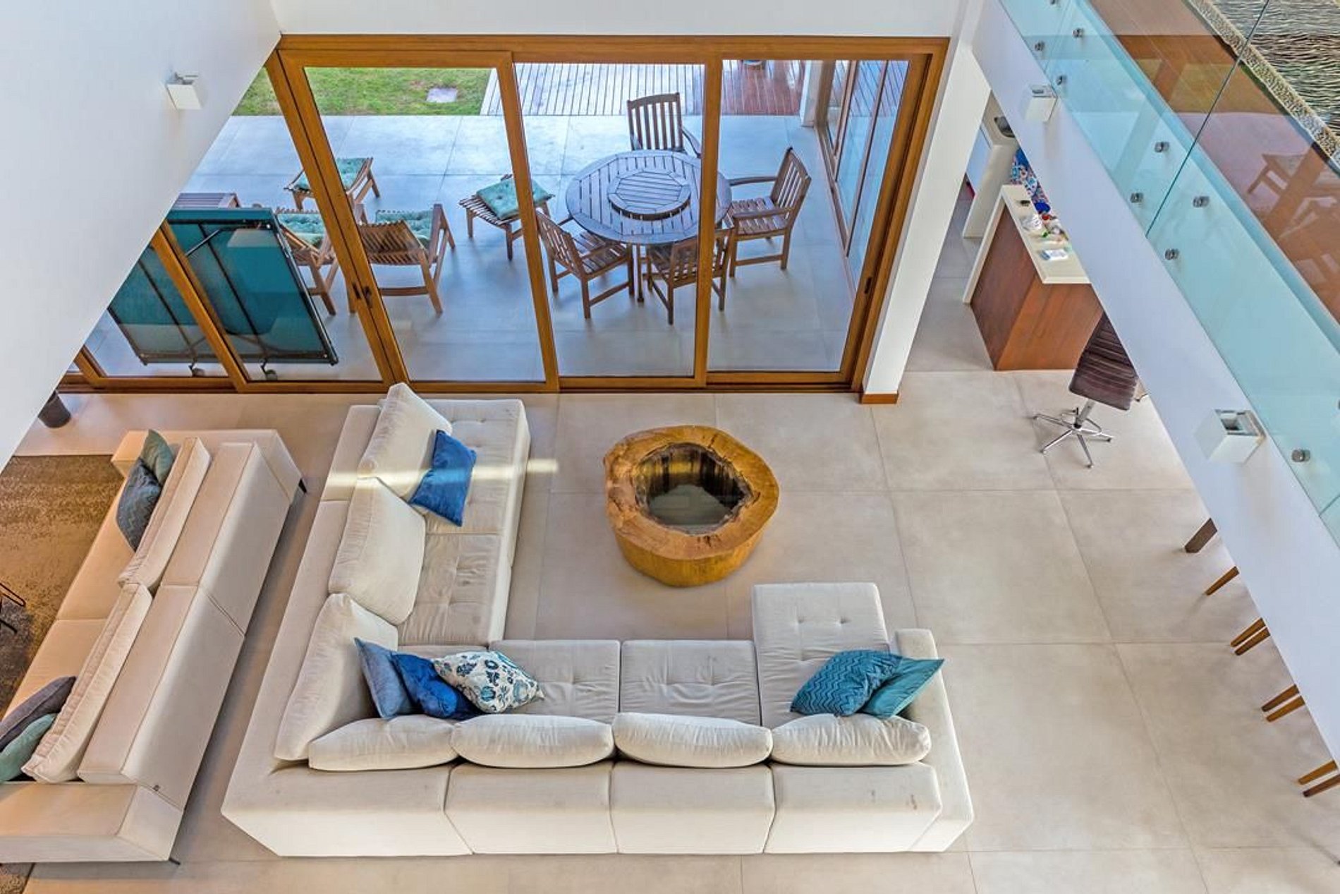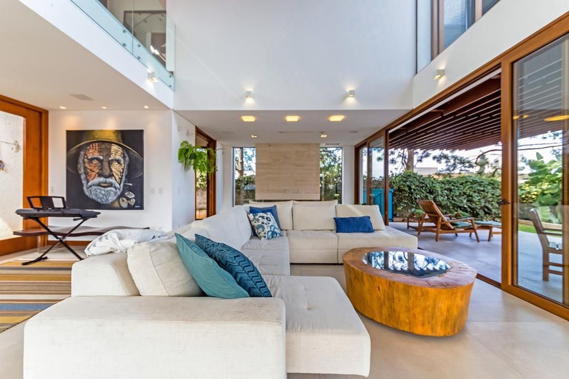 Além de sala 3 ambientes, espaço gourmet integrado à sala, escritório privativo, pé direito alto, com estilo clássico ao rústico, em madeiras e vidros. A piscina com pedras Hijau, uma tonalidade verde azulada criando um efeito de cores próximo da cor do mar, fazendo com que a piscina se integre à paisagem de forma natural. Hijau é uma pedra vulcânica, importada da Indonésia, bastante resistente, porosa, antiderrapante e por ser natural agrega muita beleza e um efeito especial na piscina, jacuzi e sauna.