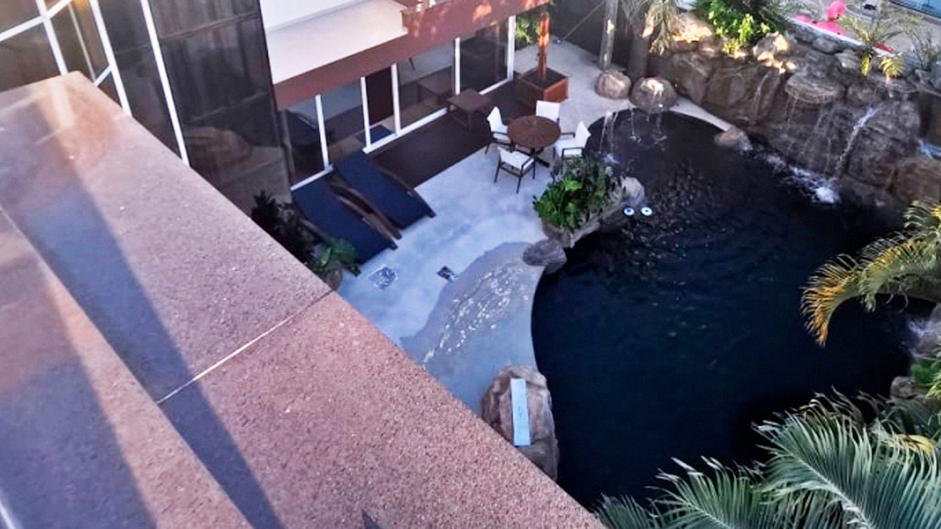 Área externa com piscina com cascata, 2 banheiras de hidromassagem, jardim frontal, varanda e terraço mobiliado com vista magnifica para o mar.