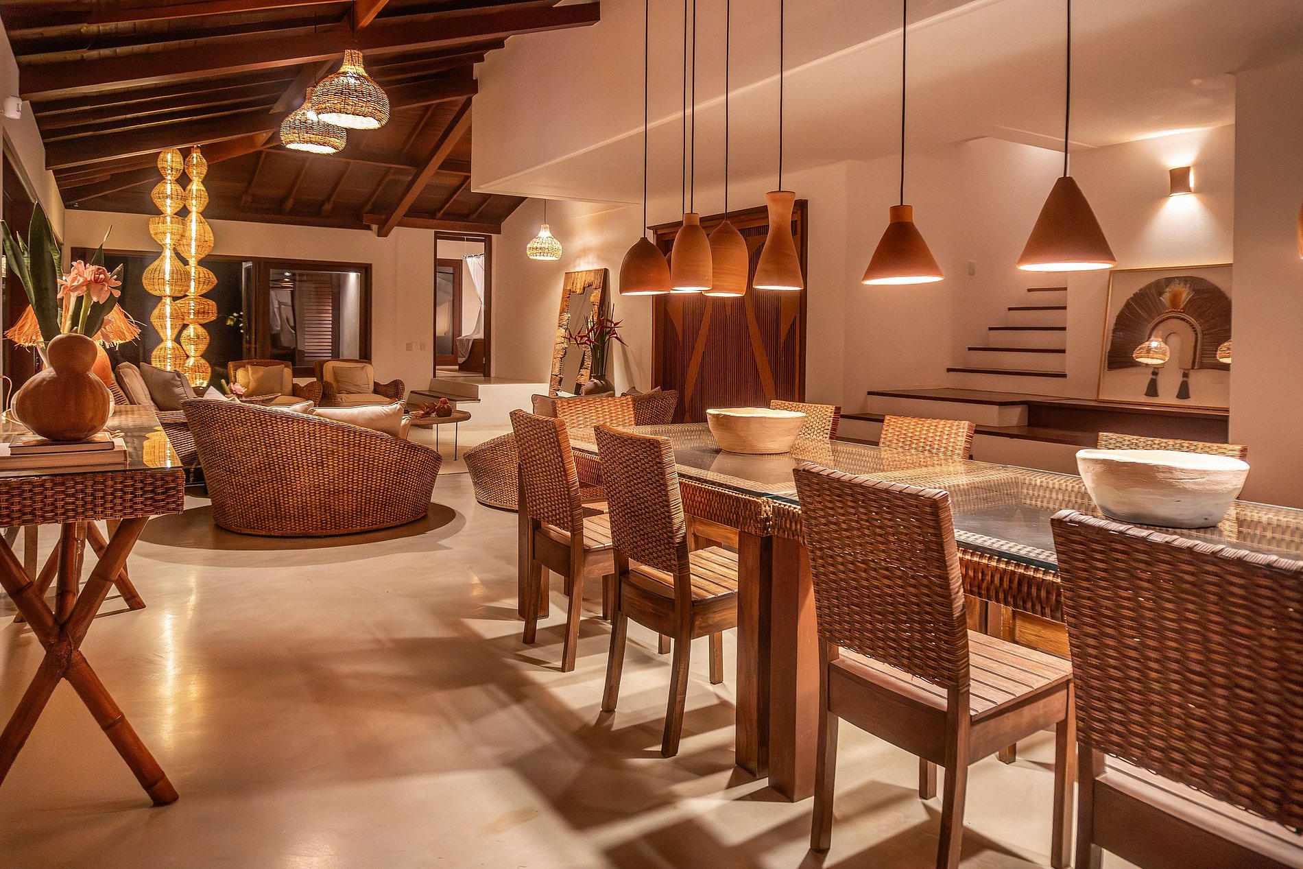 A decoração é inspirada na ilha de Bali, com um toque rústico e elegante típico do sul da Bahia. Madeiras de lei, barro e palha são elementos presentes em todo o espaço, proporcionando frescor e um clima tropical característico da região.
