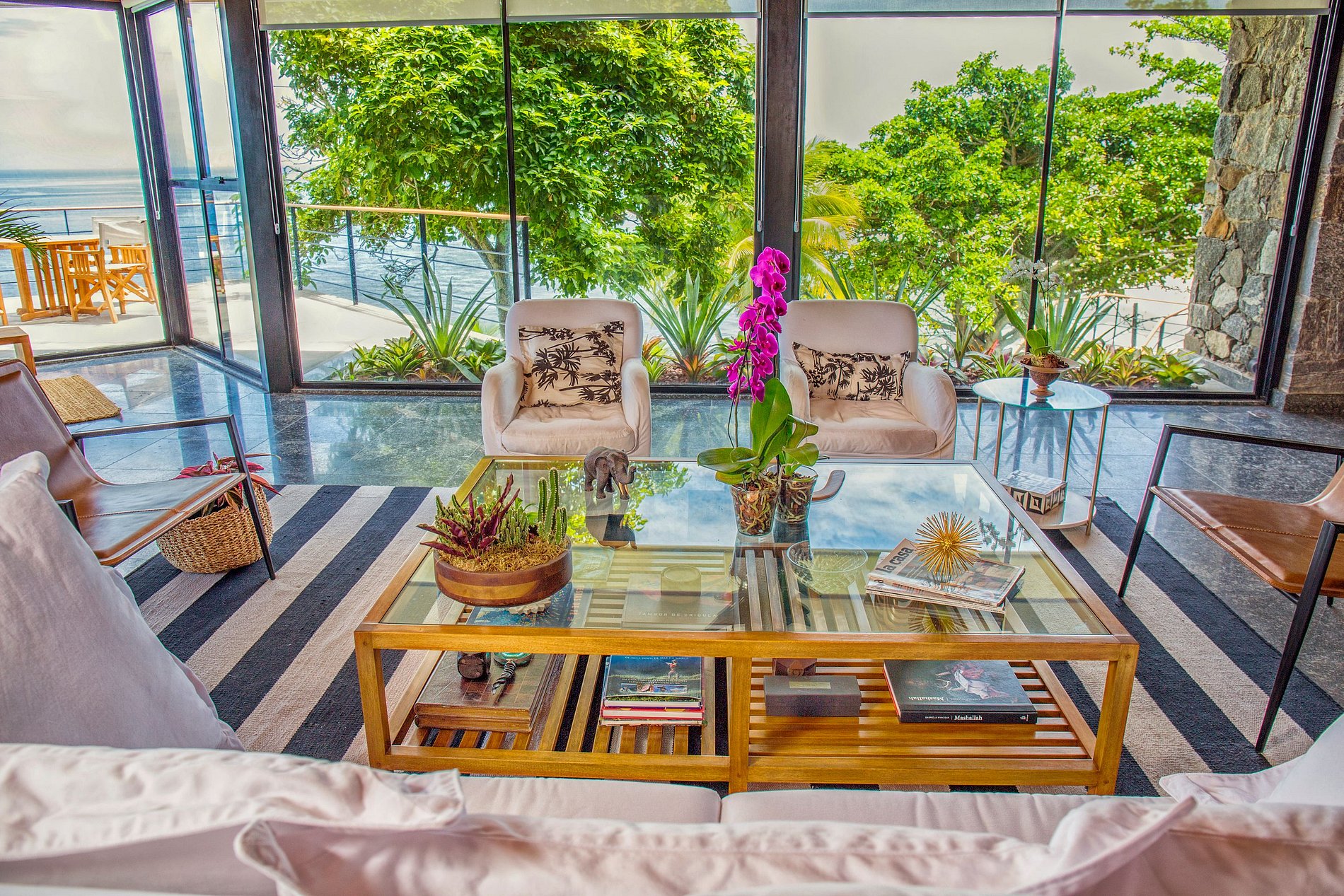 Ampla sala de estar com varanda e vista para o mar. A casa também dispõe piscina com vista para o oceano e para a Praia da Barra da Tijuca, sauna a vapor e serviço de camareira diário para seus hóspedes.