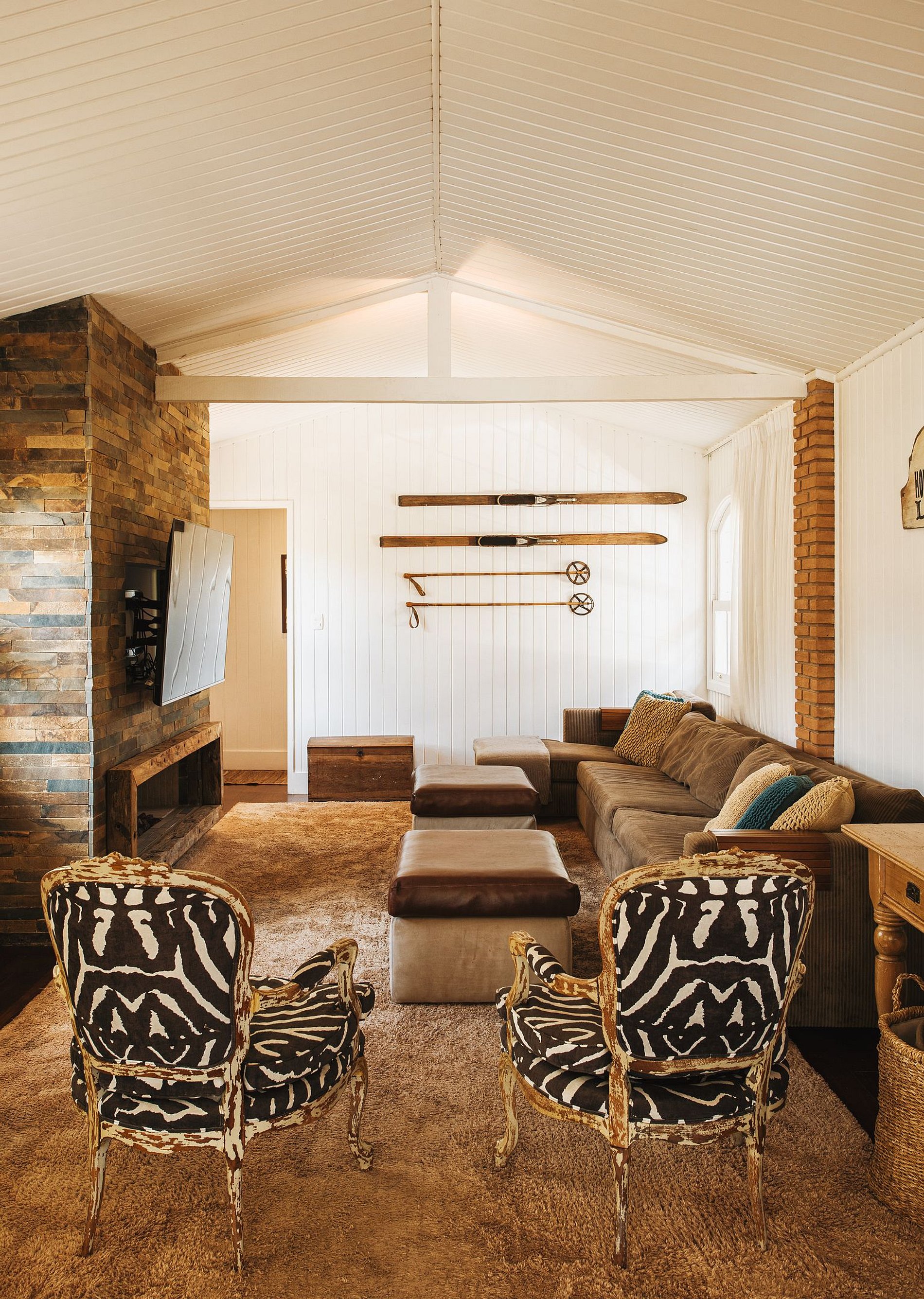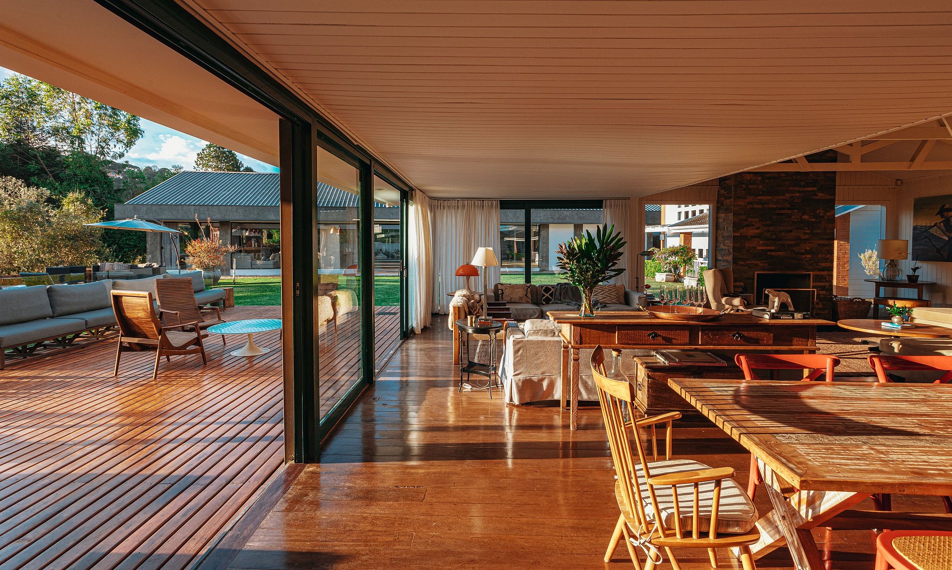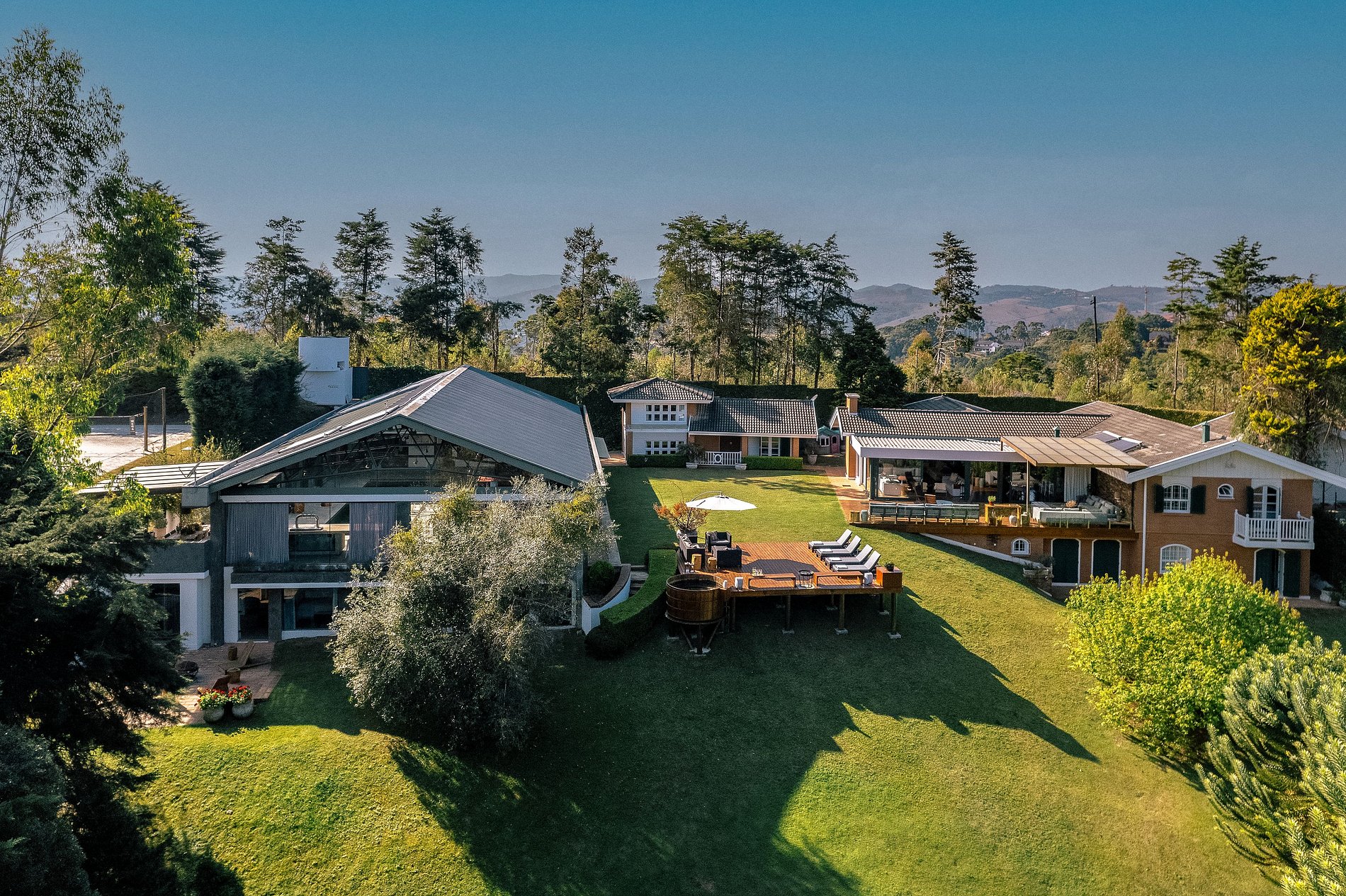 Na área externa há 2 decks para relaxar ao ar livre, um com espreguiçadeiras e ofurô e o outro com sofás e lareira externa. A propriedade possui também um galpão com mesa de snooker e pebolim, sauna úmida e piscina aquecida.