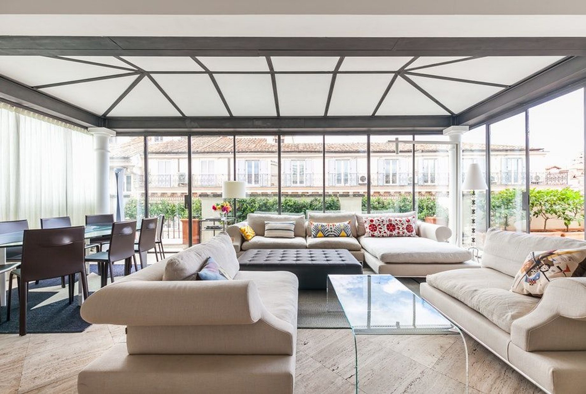 Esta casa esplendidamente situada é elegante e convidativa. Ao entrar, você entra em um corredor, que leva direto para a área de estar em plano aberto. Este quarto é decorado de forma impressionante, com piso de mármore e janelas amplas. Tem uma cozinha contemporânea em um canto, em frente ao qual você encontrará uma mesa de jantar com tampo de vidro para oito pessoas. Em seguida, a sala de estar tem um sofá de canto branco e duas poltronas combinando, e se abre para uma varanda através de uma porta ladeada por colunas. De lá, uma escadaria vai até o terraço espetacular, onde uma coleção de sofás e mesas fica de frente para alguns dos melhores pontos turísticos de Roma.