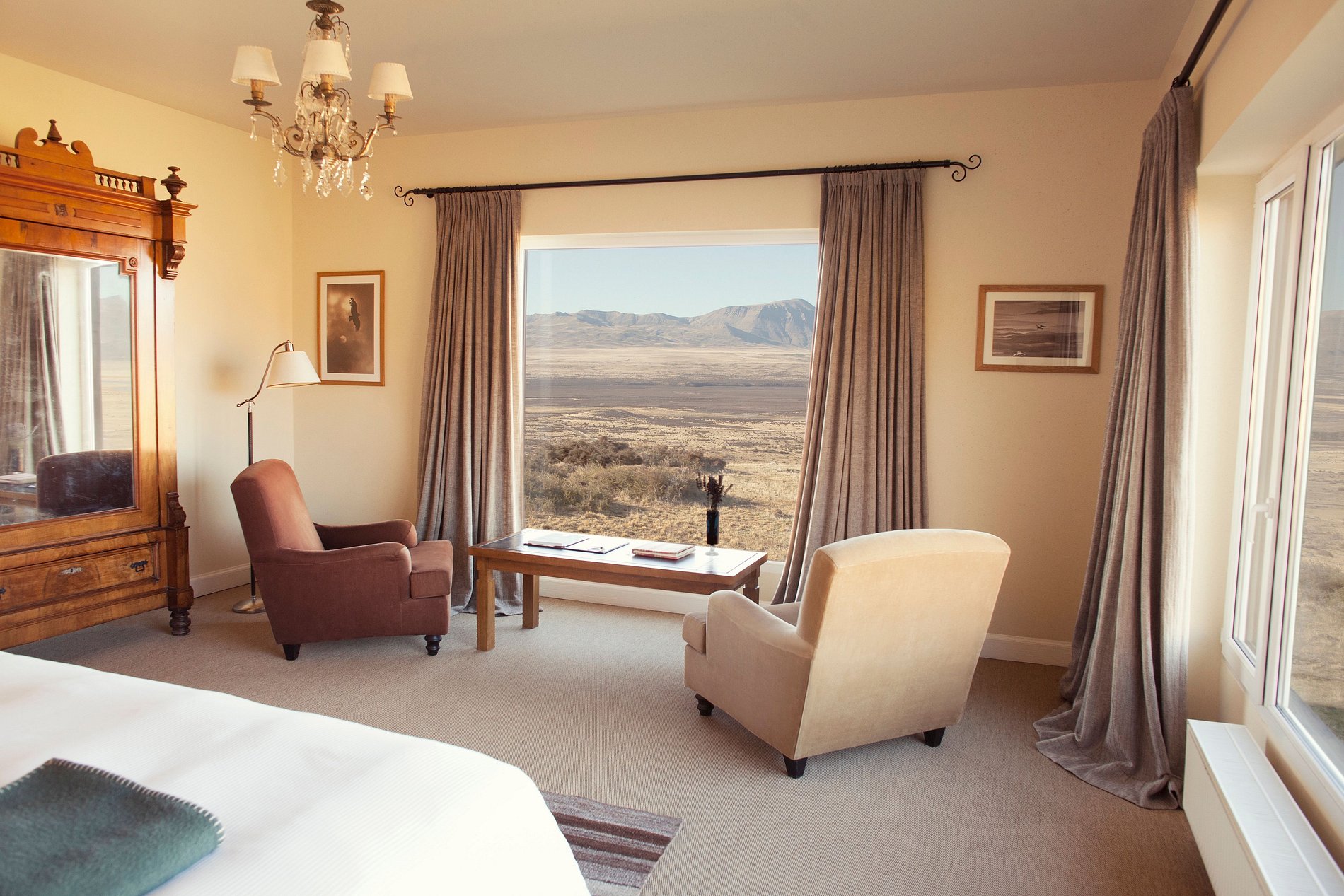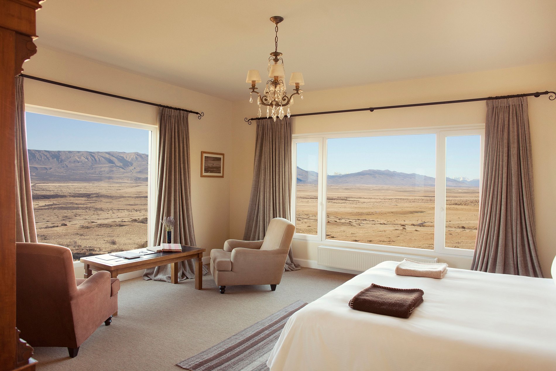 São 17 suítes: 12 Superiores, 3 Premium e 2 Corner. Todas muito amplas e confortáveis. A estadia fica ainda mais especial com as vistas deslumbrantes, seja para o Lago Argentino, Valle de La Anita, Torres del Paine ou Brazo Rico.