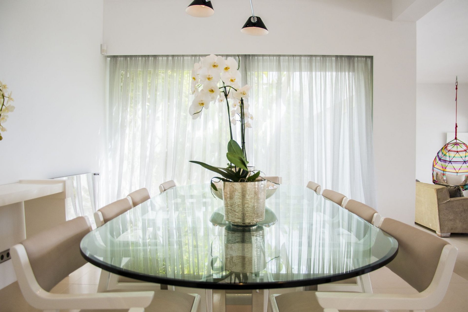 A vila possui diferentes tipos de ambientes para integração da família ou grupo de amigos como sala de estar para descontrair ou sala de jantar com mesa para acomodar 16 pessoas; como também varias suítes com sua própria varanda para os momentos de privacidade.