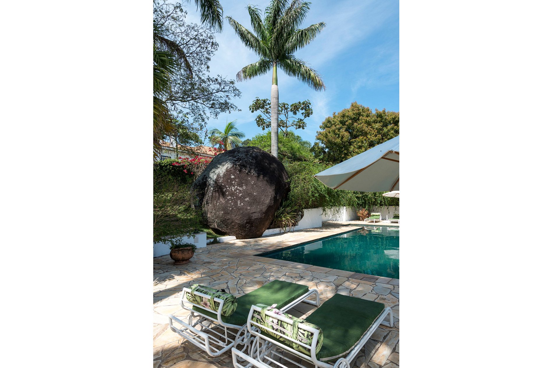 A piscina de água mineral, contornada por grandes rochas de granito, localizada perto da sede no jardim, com espreguiçadeiras e mesa para aperitivos.