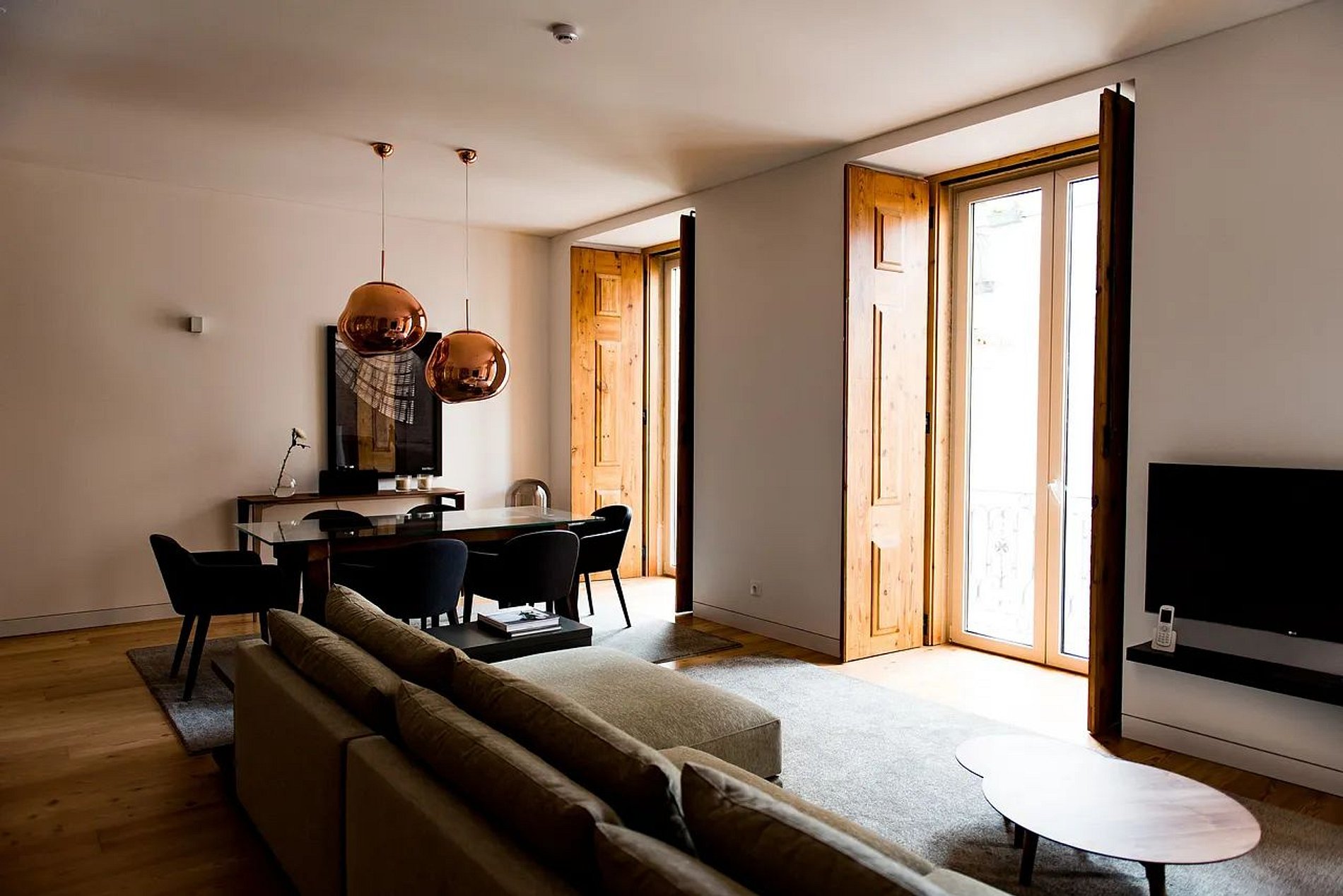 Apartamento muito espaçoso com uma ampla cozinha. As belíssimas paredes-mestras criam um sentido de divisão entre a cozinha e a sala onde o conforto do design contemporâneo rivaliza com a elegância do espaço. Virada para a luminosidade exterior, a sala, com as suas portadas de madeira antiga, tanto inspira a um animado convívio como a um recolher familiar íntimo. Dos dois quartos, um é suíte e possui cabeceira em madeira reciclada.