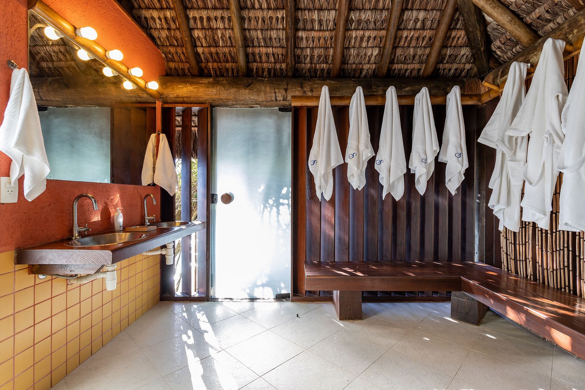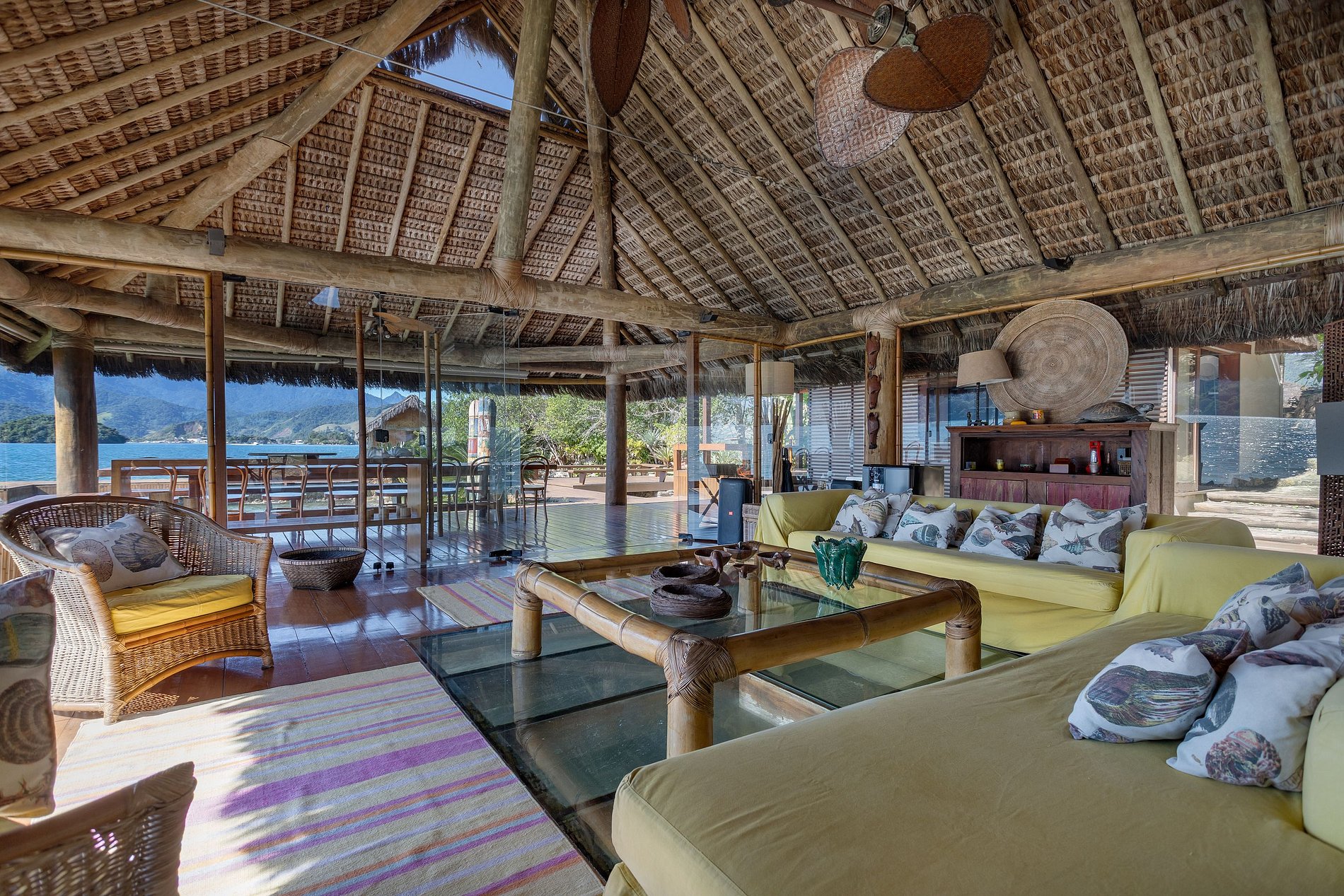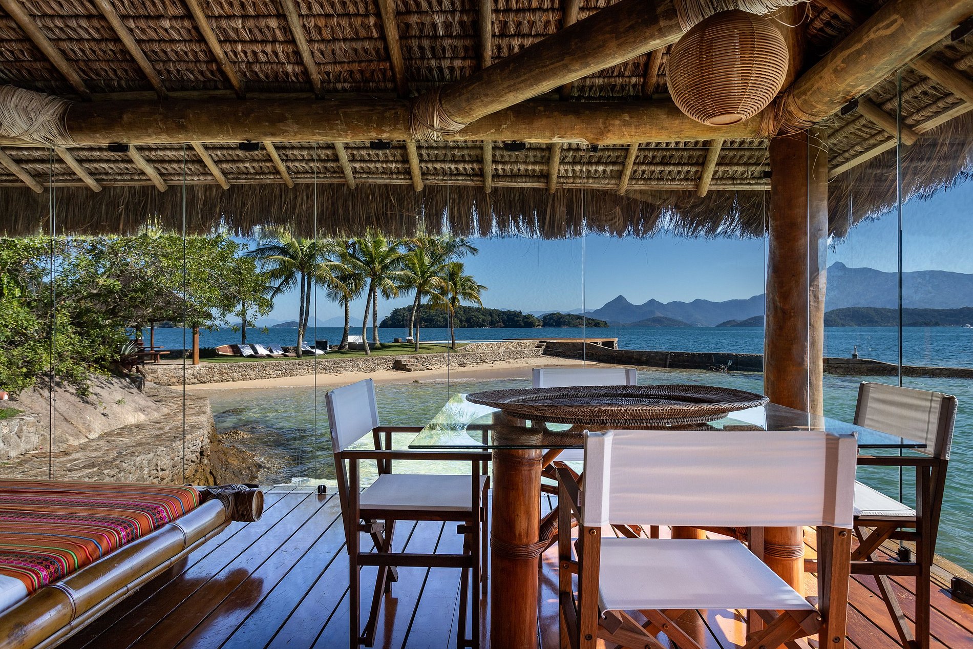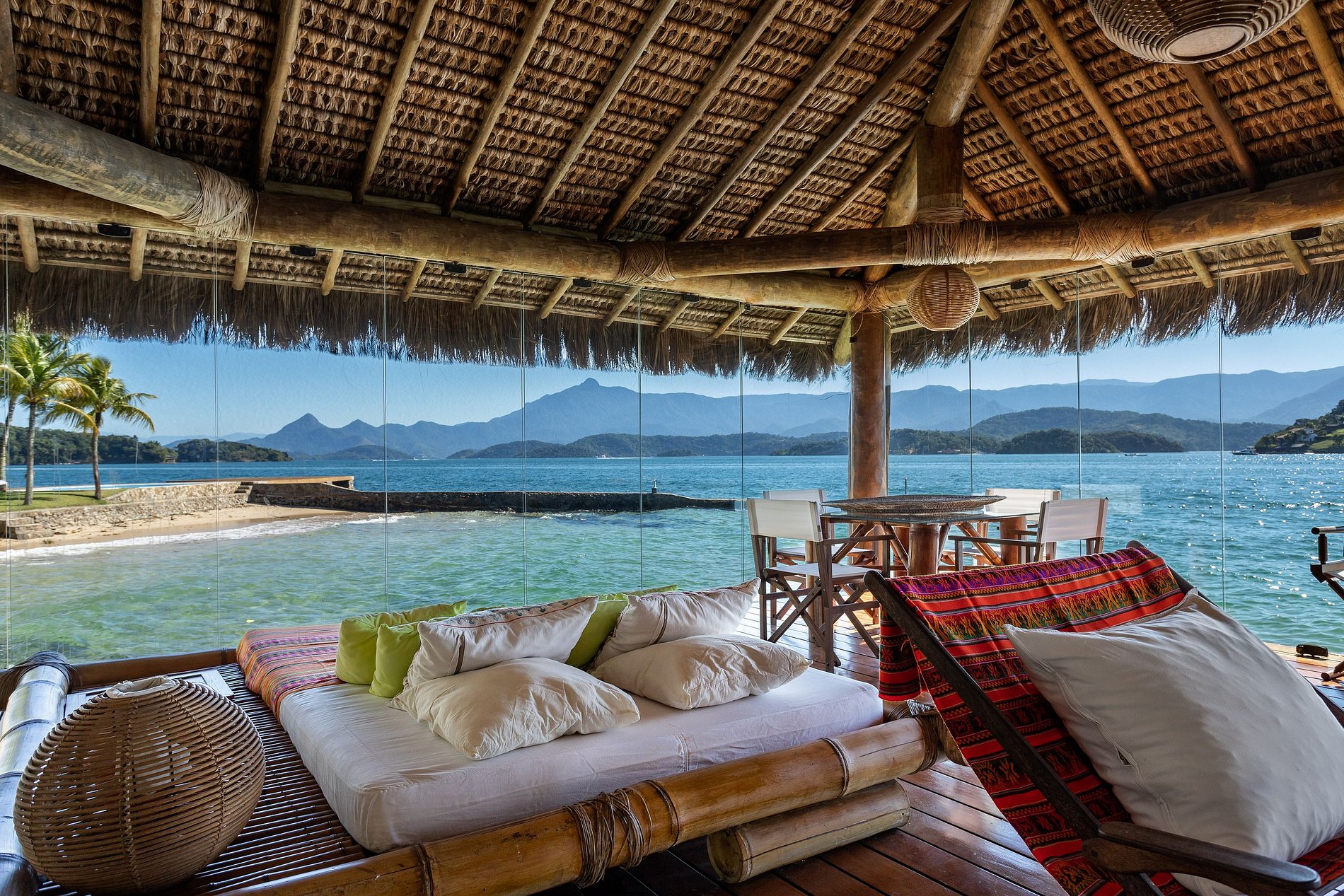 Ilha com 7 bangalôs, todos suítes, sendo 1 com 2 suítes conjugadas e outro com 2 suítes com mezanino e conjugadas.