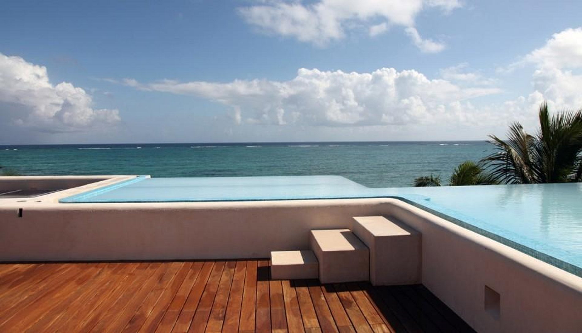 Uma piscina extra grande de borda infinita está localizada na cobertura e possui recursos de iluminação de fibra óptica. As vistas são panorâmicas do deck de madeira que rodeia a piscina.