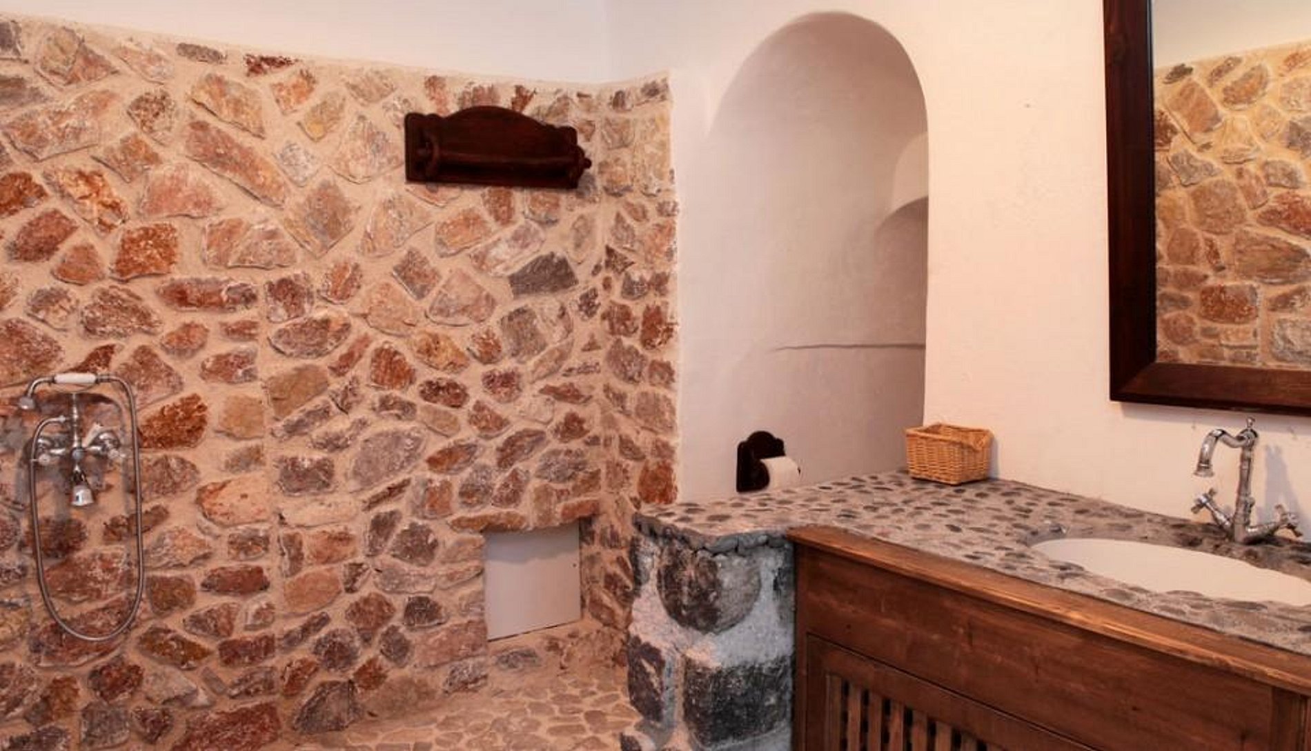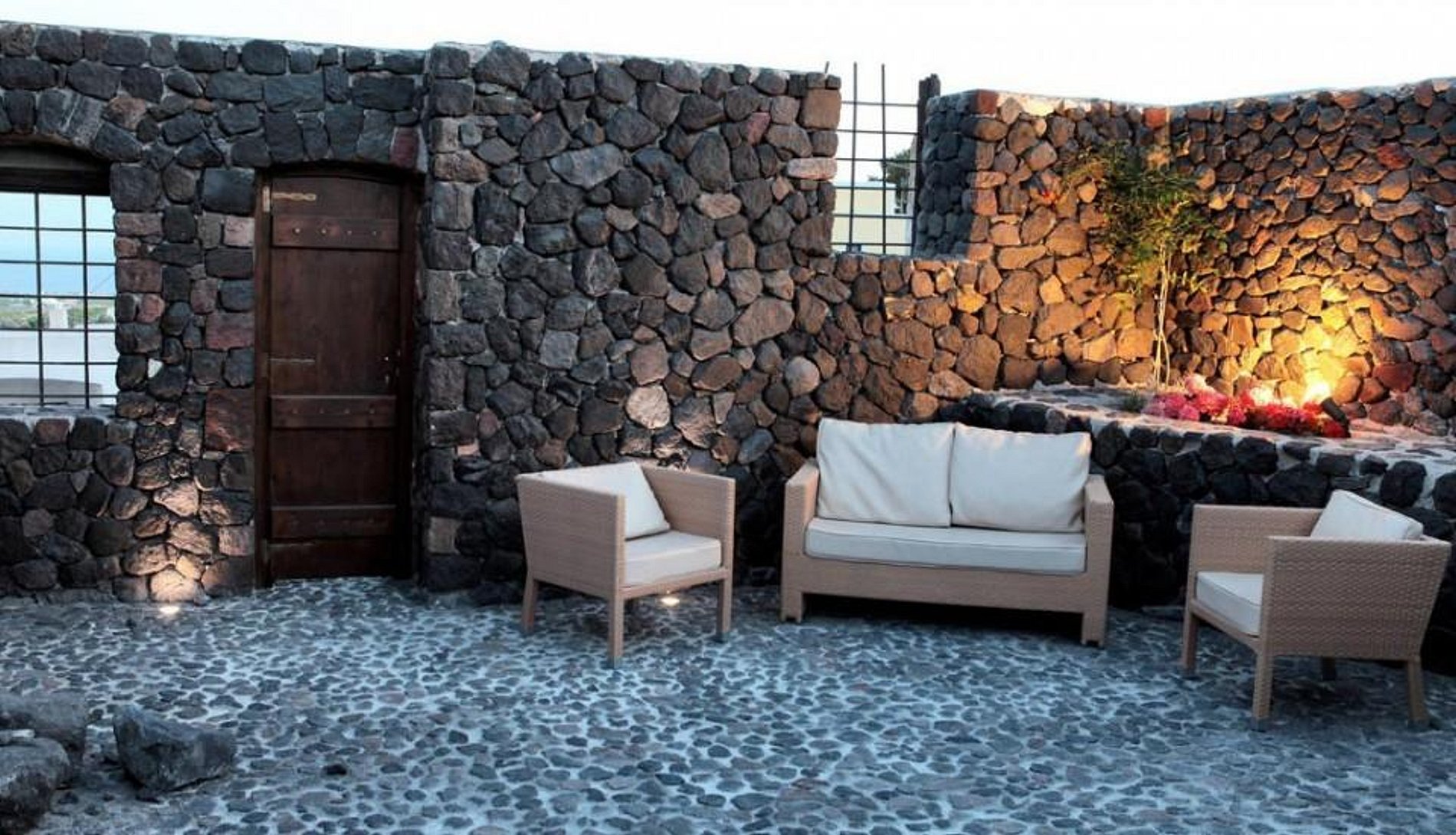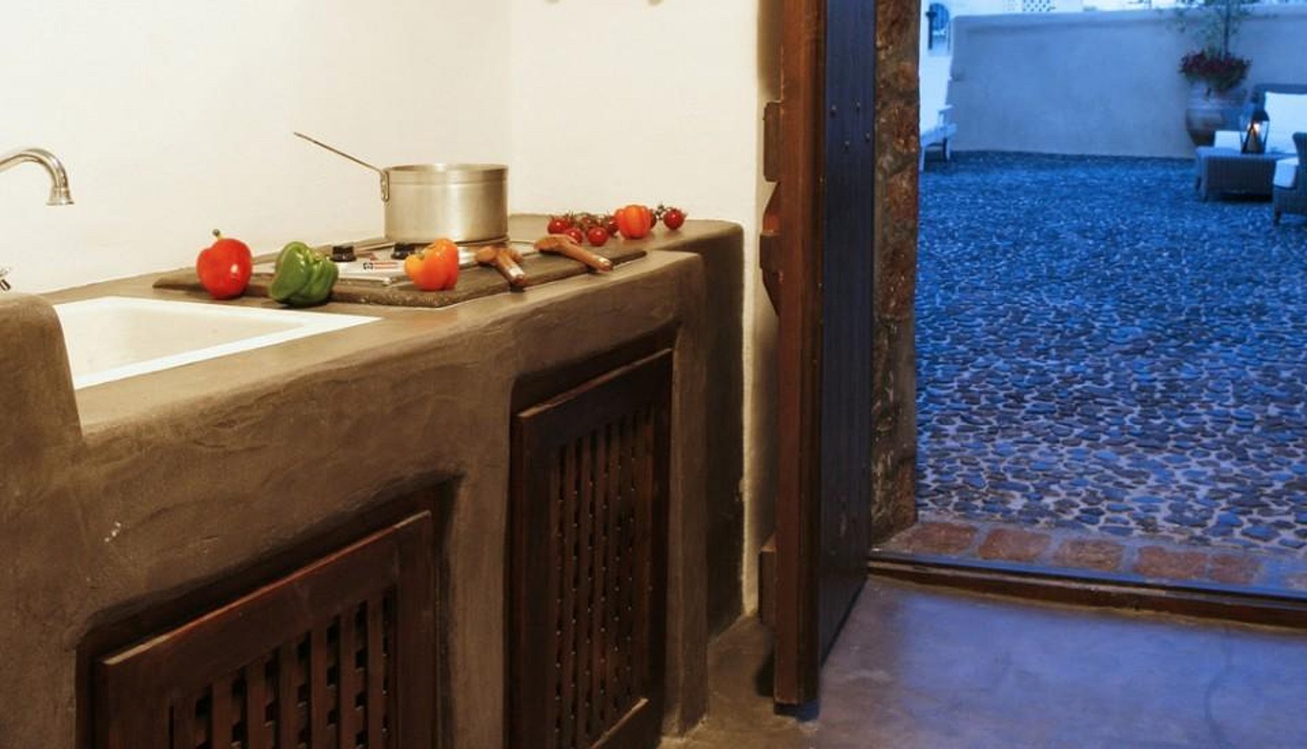 A partir da encantadora praça da cidade, uma sinuosa calçada de pedras sobe para onde os hóspedes encontram o pátio de paralelepípedos da Mansion Kyani. As três suítes muito privadas se interligam através de uma escada de pedra exterior.