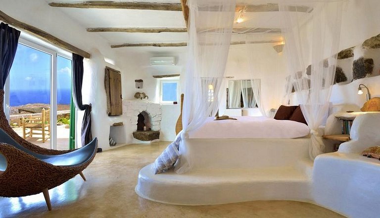 A vila possui belas antiguidades e cadeiras exclusivas em suas áreas de estar. Paredes brancas texturizadas e corredores em pedra se destacam. A cozinha em plano aberto está totalmente equipada. Adjacente, a sala de jantar é decorada em um estilo chique, mas simples. Cortinas finas brancas flutuam graciosamente para separar este quarto da entrada. A sala de estar, redonda e esculpida em pedra, tem muitos objetos antigos e peças de arte, bem como uma televisão e som estéreo escondido atrás de uma porta de madeira antiga. Uma lareira proporciona calor. As salas de estar abrem para um amplo terraço e área de jantar ao ar livre em forma de pérgola. Há um banheiro com ducha adicional para uso dos hóspedes perto das áreas de convivência.