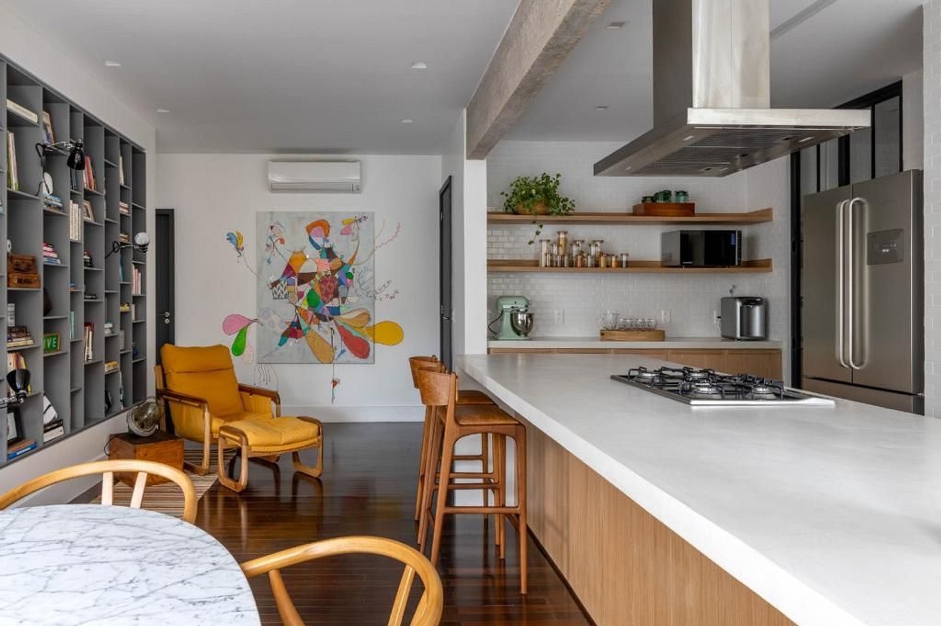 Ambiente Integrado: Cozinha gourmet totalmente equipada, sala de estar com projetor e mesa de jantar para 6 pessoas, e um cantinho de leitura convidativo.