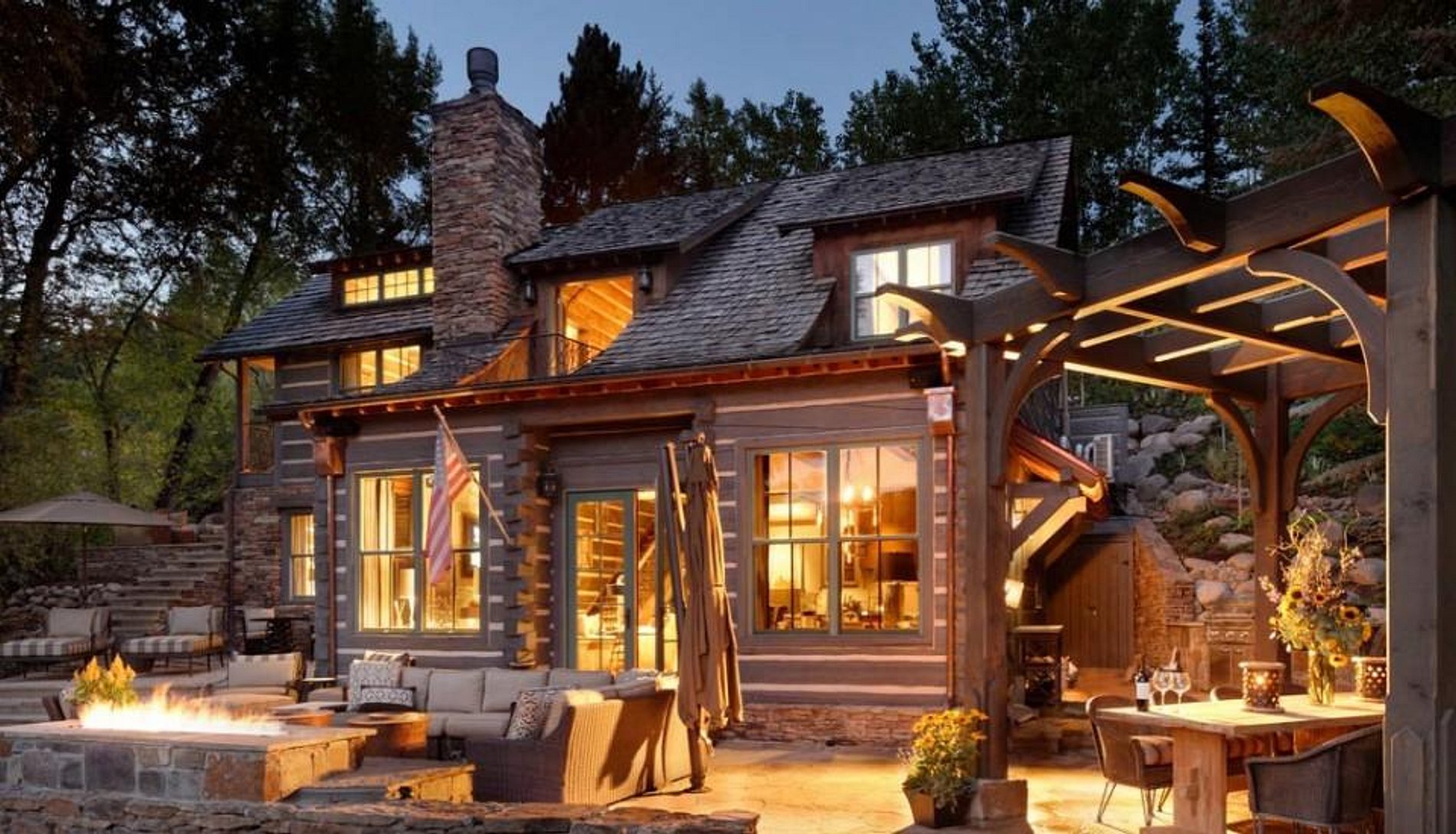 A sala de estar e de jantar de plano aberto e cozinha abrem para um deck de pedra externo com vista para o rio Roaring Fork.