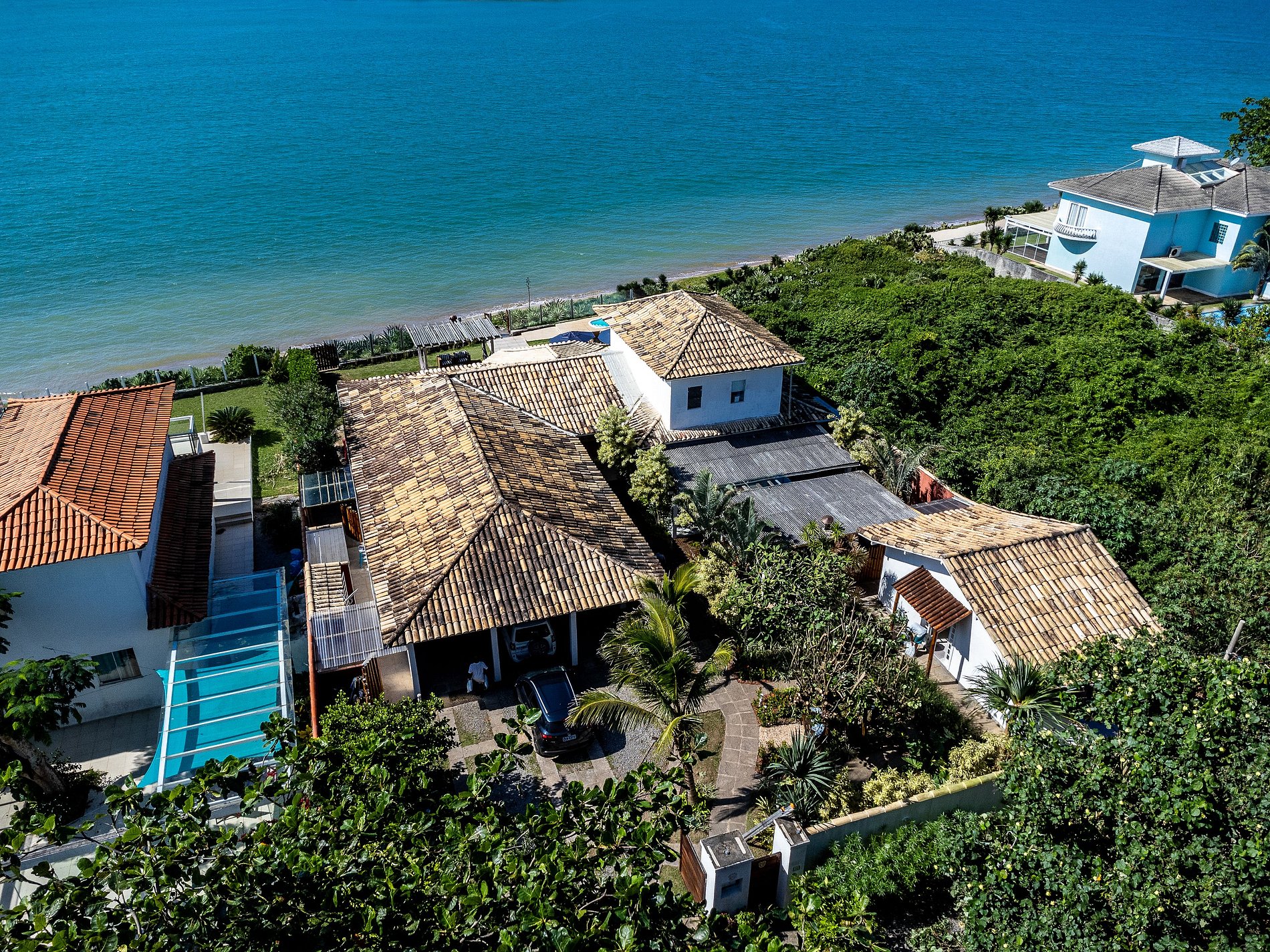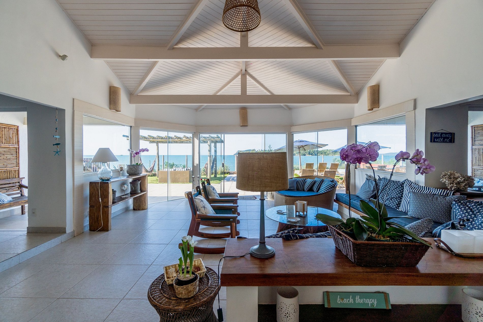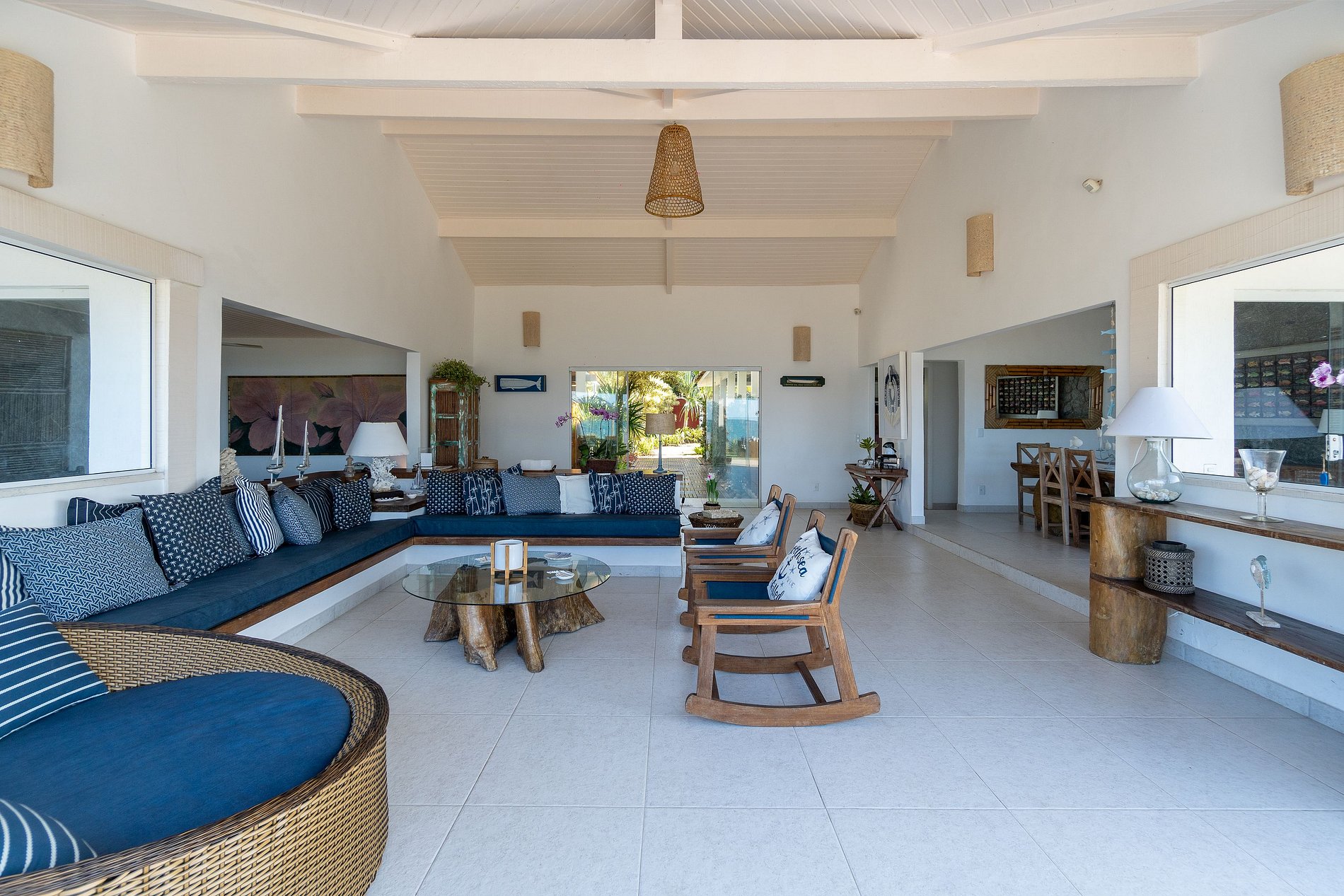 Ampla conta com sala de estar, sala de TV e sala de jantar com vista para o mar.