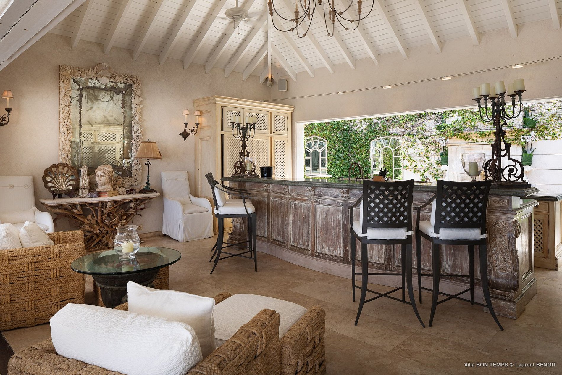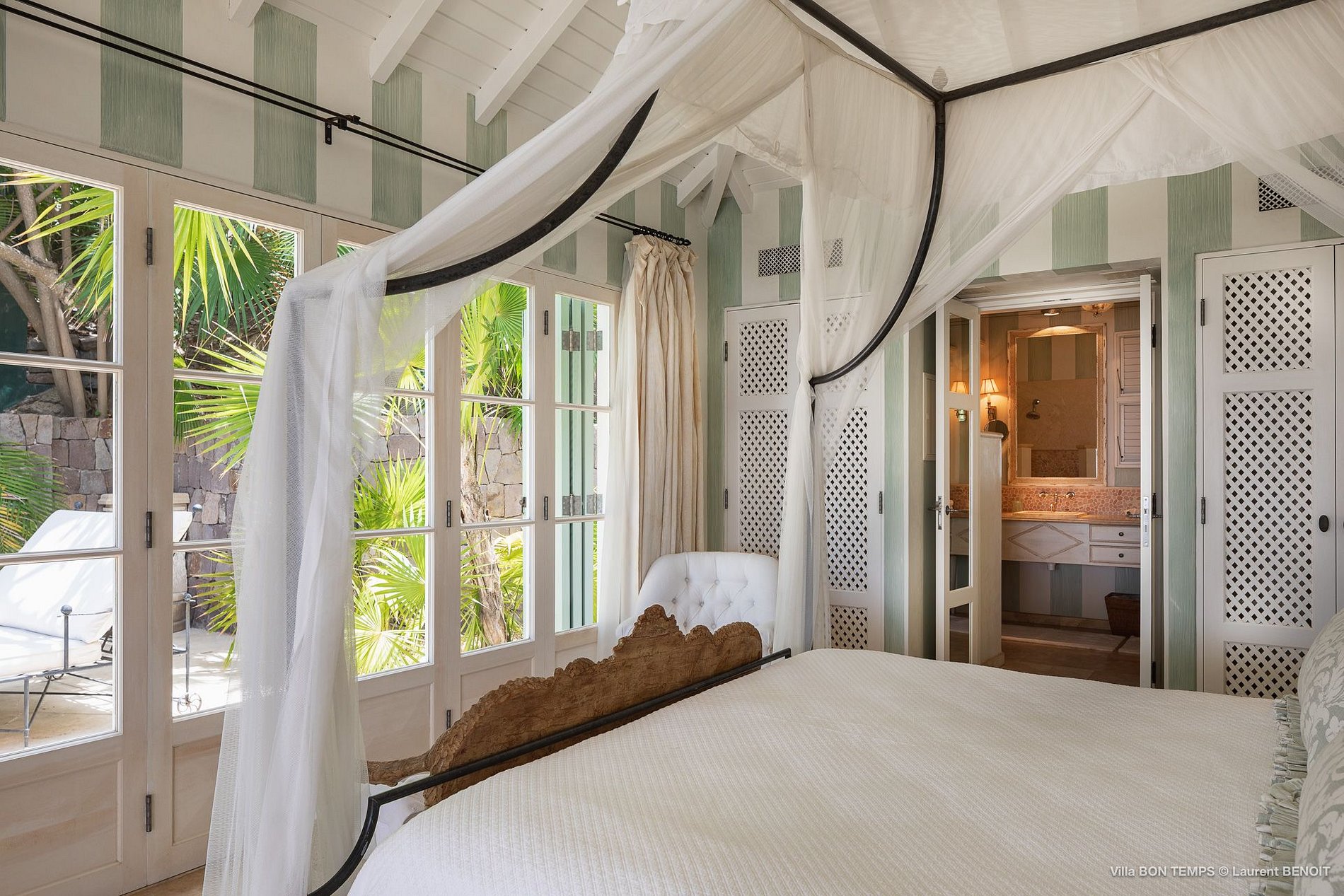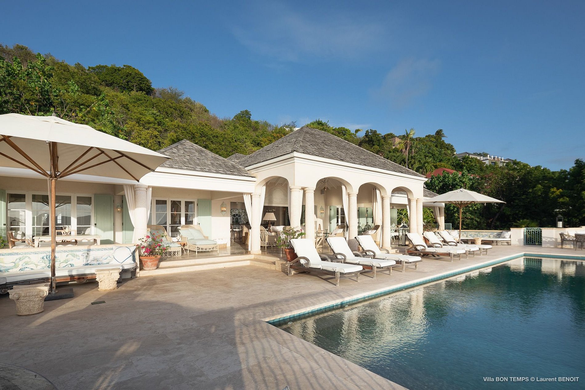 Villa Bon Temps é decorada em suaves tons naturais de azul e verde contra um fundo de creme e off-white. O piso de mosaico feito sob encomenda, os detalhes pintados à mão da telha e uma coluna de pedra que oferece sombra contra o sol dão a excepcional sensação mediterrânea a essa casa. Os seis quartos da villa são igualmente bem equipados, com tetos altos, banheiros em azulejos de travertino e vista para o mar. Quatro dos quartos estão no mesmo nível que a casa principal, enquanto os outros dois estão em um nível mais baixo e oferecem varandas cobertas privadas.