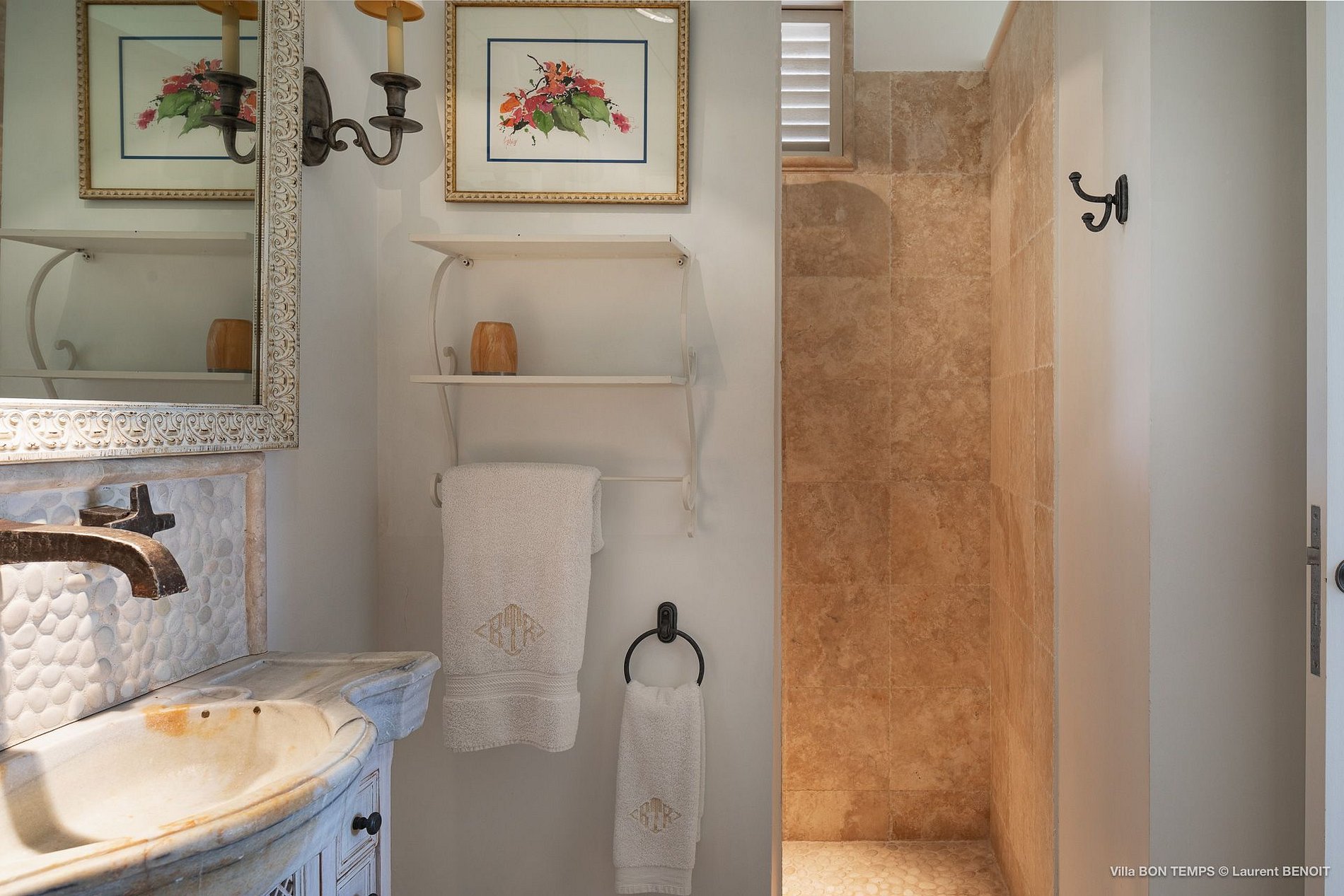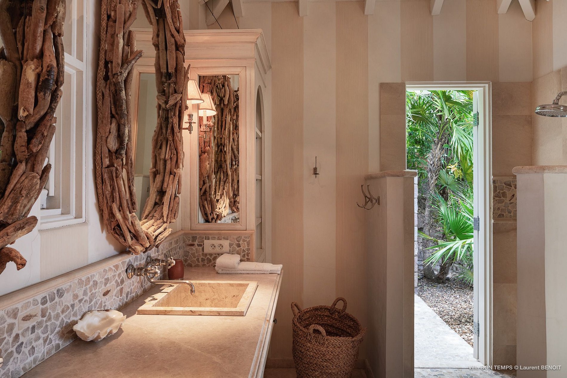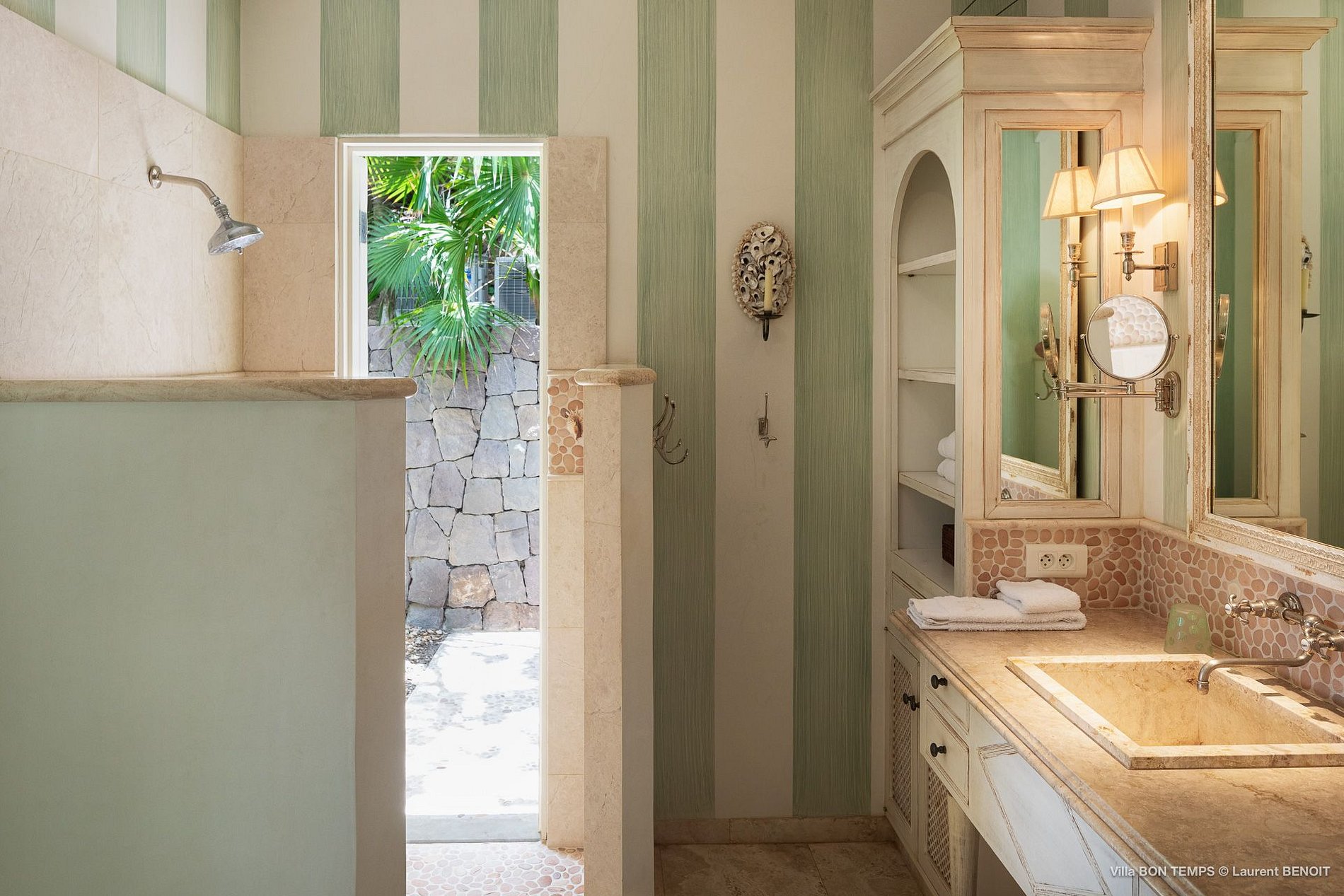 Villa Bon Temps é decorada em suaves tons naturais de azul e verde contra um fundo de creme e off-white. O piso de mosaico feito sob encomenda, os detalhes pintados à mão da telha e uma coluna de pedra que oferece sombra contra o sol dão a excepcional sensação mediterrânea a essa casa. Os seis quartos da villa são igualmente bem equipados, com tetos altos, banheiros em azulejos de travertino e vista para o mar. Quatro dos quartos estão no mesmo nível que a casa principal, enquanto os outros dois estão em um nível mais baixo e oferecem varandas cobertas privadas.