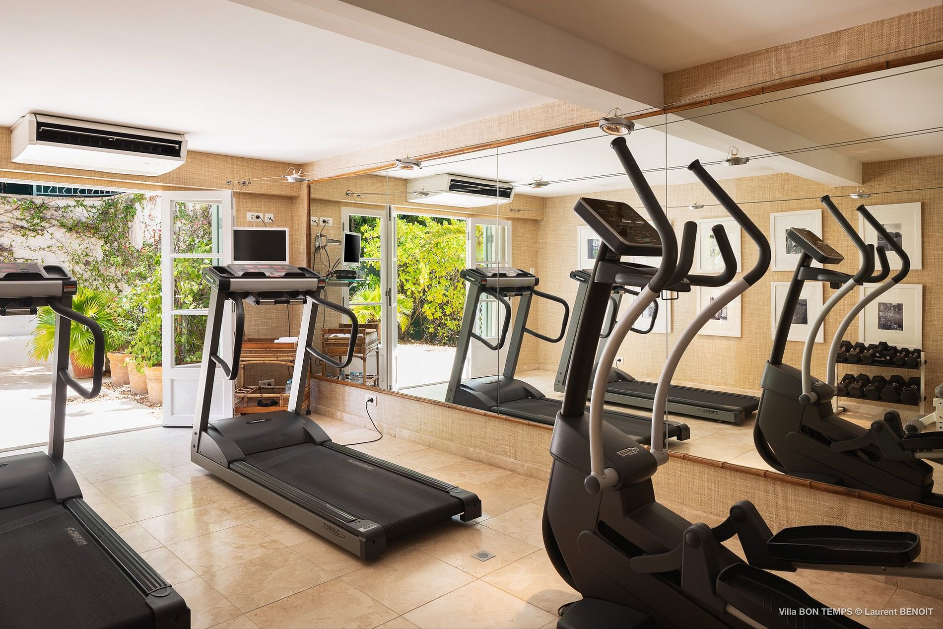 A cozinha profissional ao ar livre está equipada com um fogão LaCanche, balcões em mármore, utensílios de vidro italianos e franceses únicos, pratos, roupa de cama e mesa para entretenimento. Villa Bon Temps também oferece aos seus hóspedes as conveniências modernas de uma HDTV na cozinha e alguns quartos, bem como a sala de estar, um sistema de som com alto-falantes internos e externos e uma sala de fitness bem equipada.