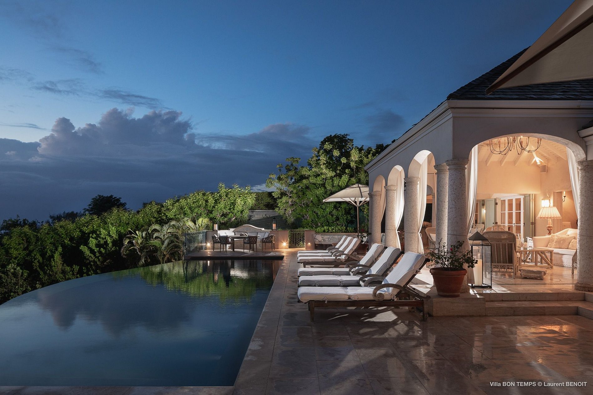 Situado no lado oeste da península de Pointe Milou, a Villa Bon Temps oferece um estilo de vida gracioso no cenário perfeito do Caribe, em meio a exuberante folhagem tropical e com vistas incomparáveis do pôr do sol. Do amplo terraço de pedra elegantemente projetado, a água clara da piscina de borda infinita de 50 pés parece se fundir com o azul da Baía de Lorient, os ilhéus de Chavreaux e Fourchue e a ilha de St. Maarten visível à distância.