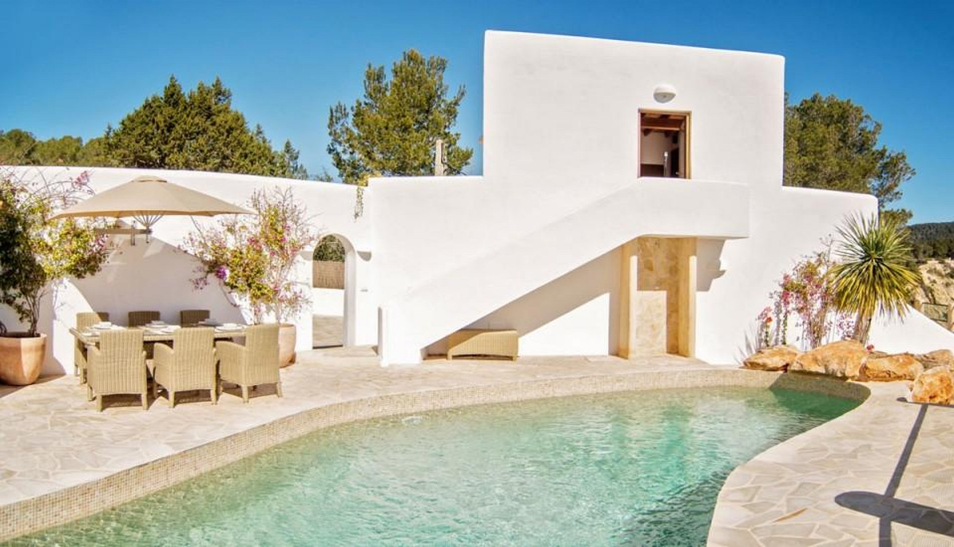 Villa Sol y Sierra é uma vila à beira-mar maravilhosa, localizado na costa leste de Ibiza. Villa Sol y Sierra é composta por uma casa principal e um anexo de hóspedes. Esta extensa propriedade situada no alto com vista e acesso para o mar pode acomodar até 10 pessoas e tem várias áreas de lazer, para relaxar e simplesmente desfrutar da incrível vistas sobre a costa espanhola.