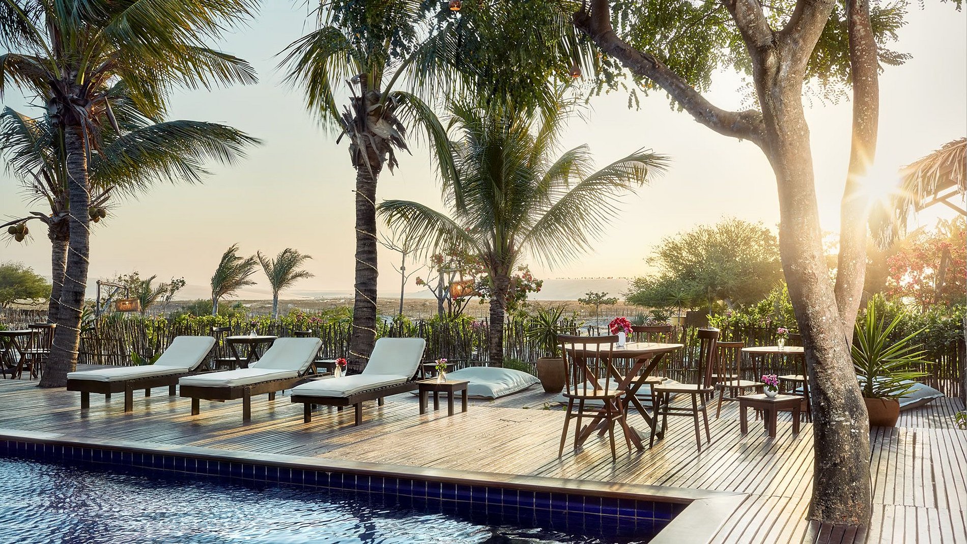 Idealizada por um arquiteto brasileiro, os espaços amplos são naturalmente paradisíacos, com areia, flores, coqueiros, madeira e palha. Conforto que emerge dos seus quartos trabalhados, de  sua grande piscina e bar.