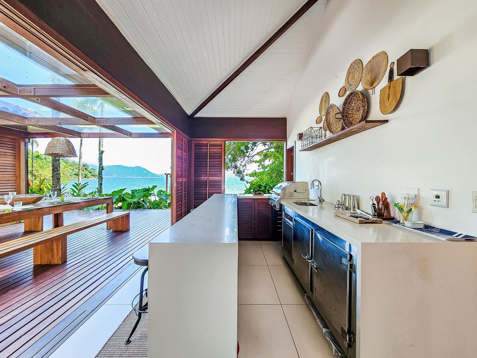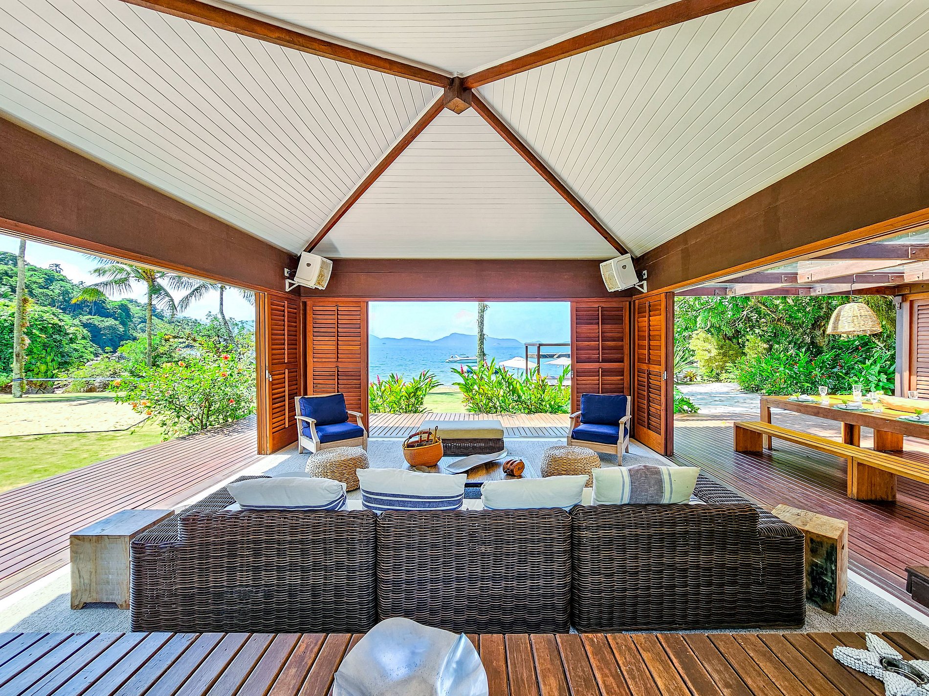 Na Casa Principal além da bela vista para a baia de Angra, Sala de Tv com SkyTV, Sala de Jantar, Cozinha, lavabo e 7 suites todas com ar condicionado e wifi, para até 18 hóspedes.