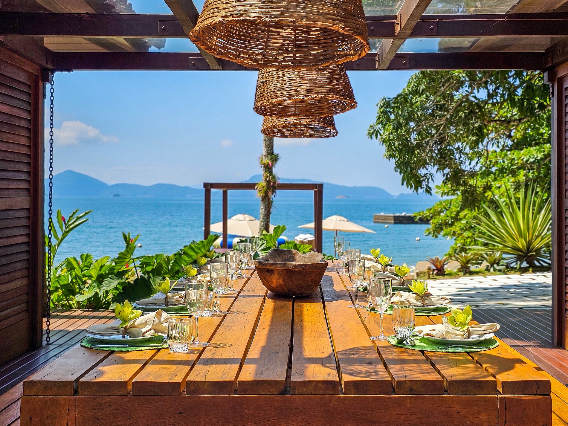 Na Casa Principal além da bela vista para a baia de Angra, Sala de Tv com SkyTV, Sala de Jantar, Cozinha, lavabo e 7 suites todas com ar condicionado e wifi, para até 18 hóspedes.