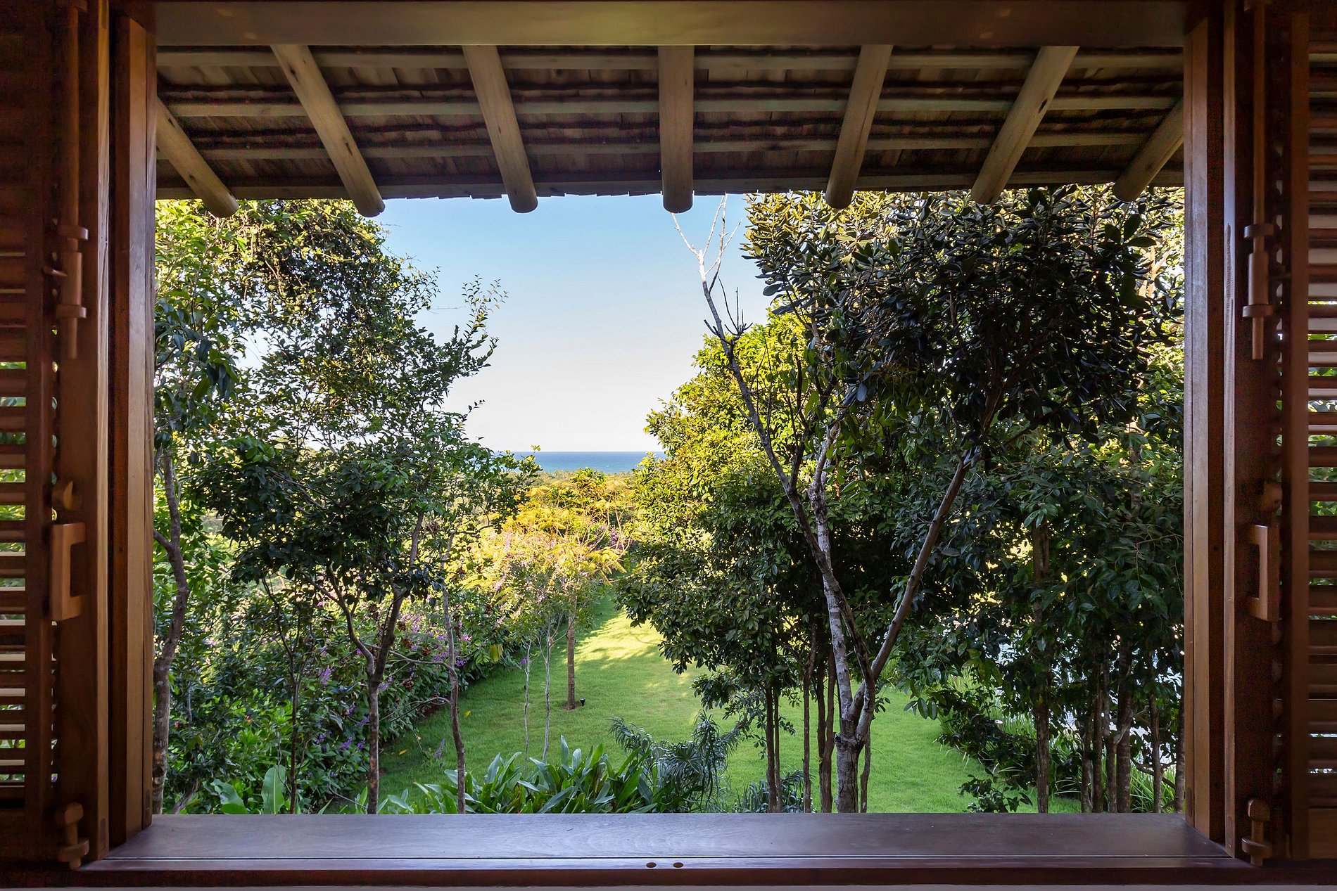 As imensas janelas de vidro no living social possibilitam uma vista privilegiada do verde ao redor, da piscina com formato orgânico em um deck de madeira, pergolado com um charmoso sofá, um amplo gramado e o mar como plano de fundo.