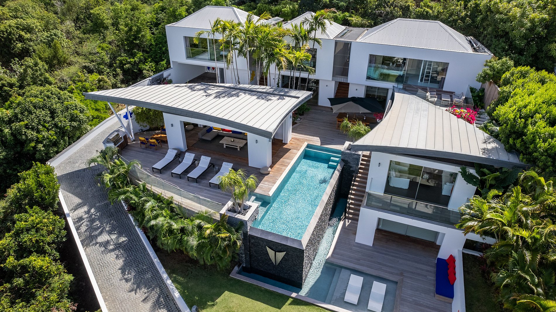 Localizada em um dos bairros mais populares da ilha, a encosta de St. Jean com vista para Pelican Beach, Wings House, também possui um dos melhores pedigrees arquitetônicas de St. Barth. Concebido e criado por Olivier Dain com a contribuição vital dos proprietários, esta casa é uma afirmação estética, bem como um espaço de vida. Duas asas graciosas de aço galvanizado dão a vila o seu nome e afirmam claramente à primeira vista que esta é, no sentido mais verdadeiro, uma casa notável. Tanto acima como abaixo essas duas esculturas arquitetônicas atraentes causam uma sensação de ousadia e graça.