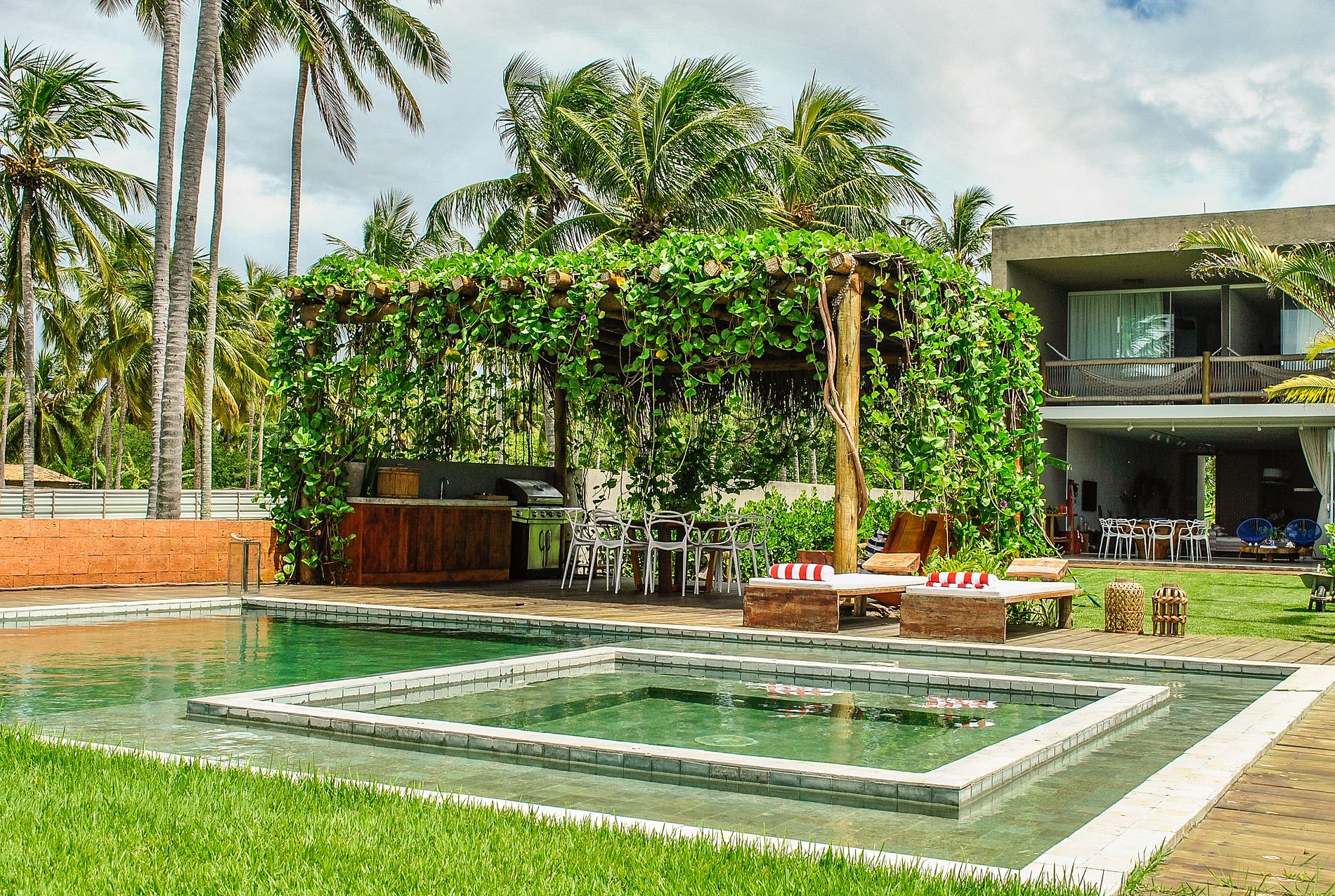 A área externa possui gazebos individuais com bancada de apoio para churrasqueira e piscina.
