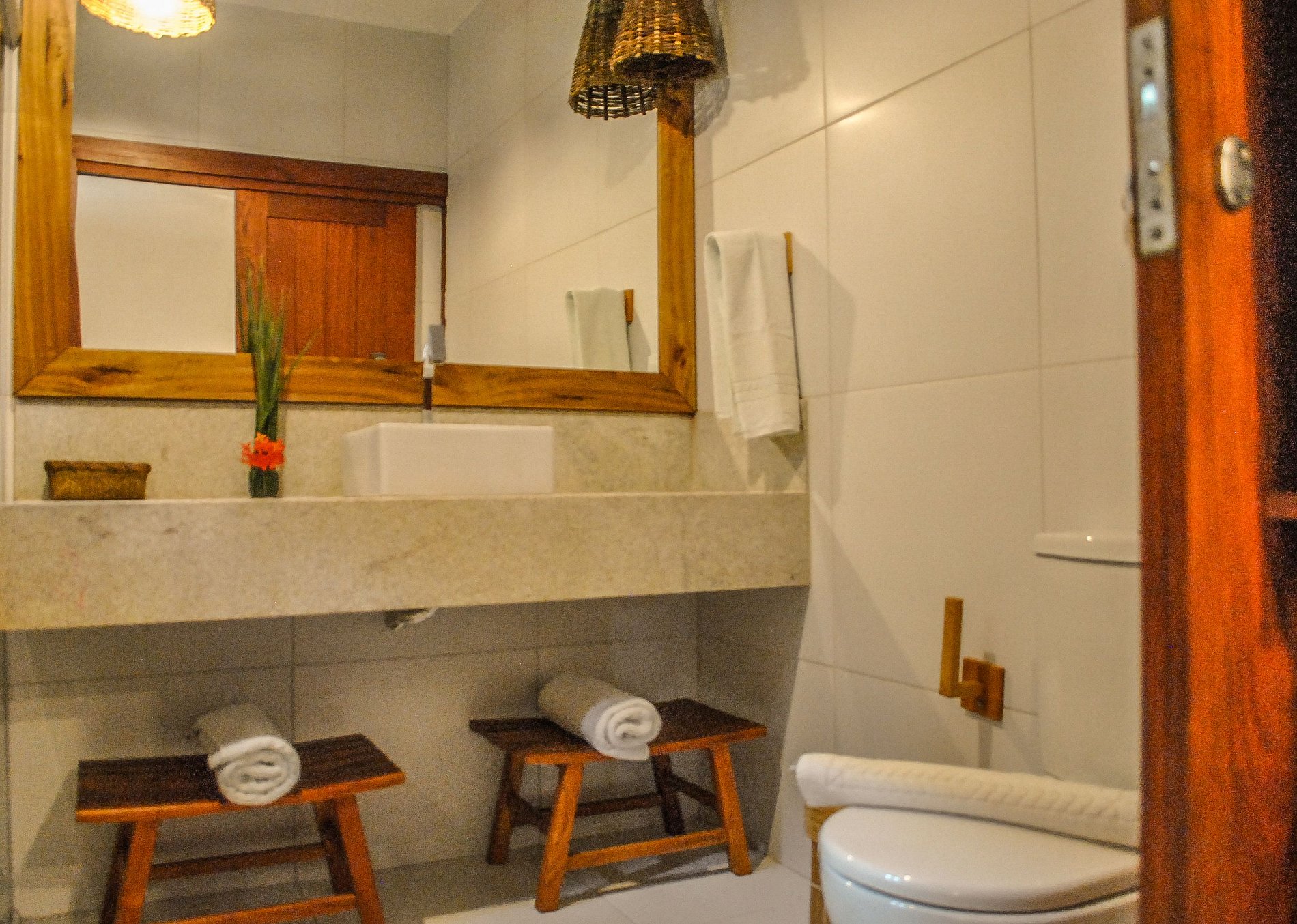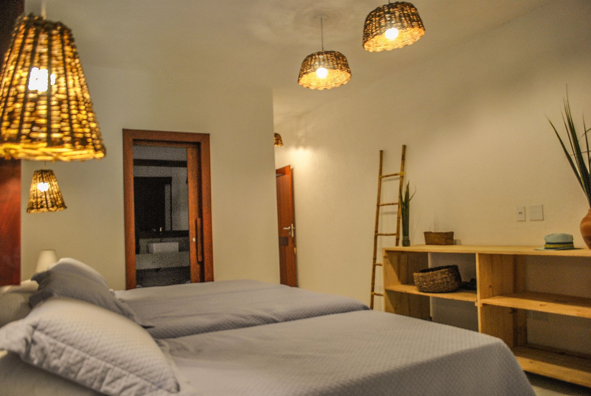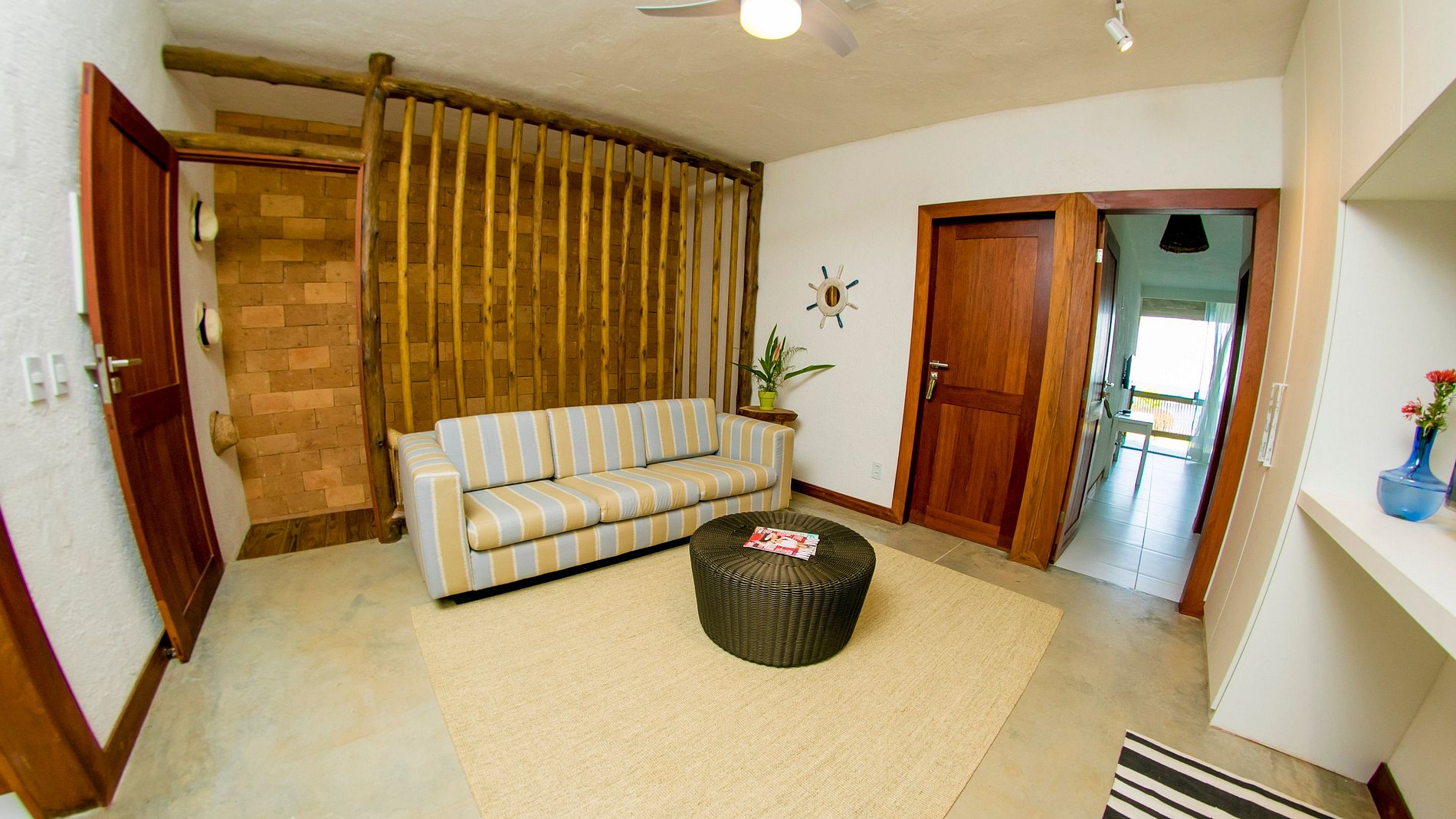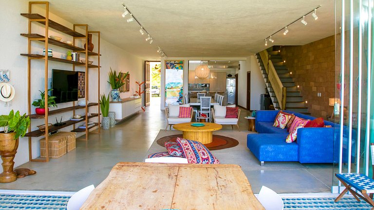 Todas as 5 suítes com a mesma estrutura com ar condicionado tipo split, sendo duas com varanda frente mar e 3 com vista Lateral, todas com aquecimento solar e mezanino na parte superior. O piso térreo é integrado com cozinha, sala de jantar, estar com TV e varanda, contando, ainda com DCE.