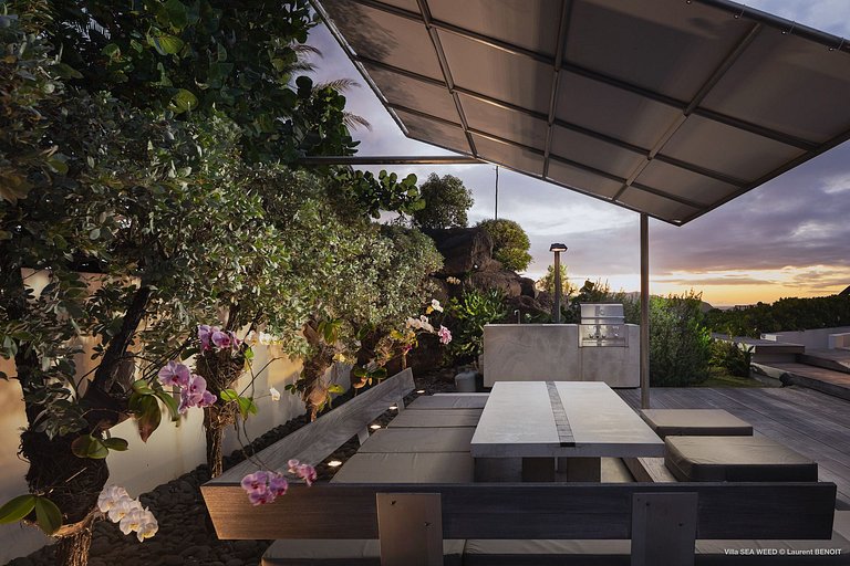 Na crista do monte que encabeça o exclusivo bairro de Pointe Milou, Villa Seaweed expressa-se em desenhos únicos e bem planejados em todos os sentidos possíveis: paisagismo, arquitetura e decoração. O caminho para a casa é acompanhado por um mar de plantas aquáticas e arbustos reminiscentes de uma casa no Hamptons - apenas o agave azul gigante ao lado da casa lembra que se está no Caribe. Uma vez dentro da casa, você é recebido pela visão acolhedora da piscina aquecida de três níveis durante todo o ano, um deck de madeira em meio a um misto de bougainvilles roxos e um amplo gramado verde. A vista para a ilha de St. Maarten torna este o ponto de vista perfeito para o pôr do sol.