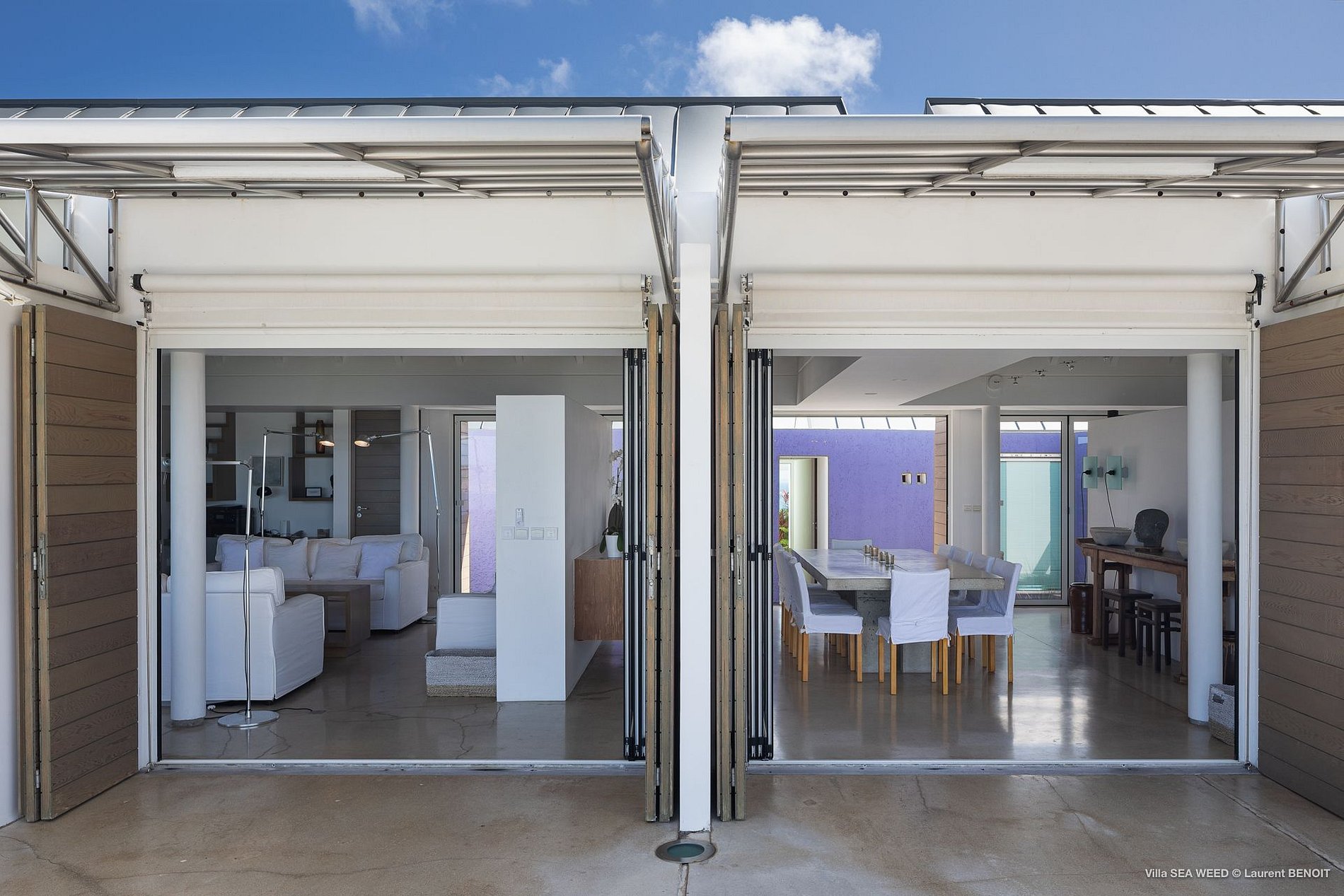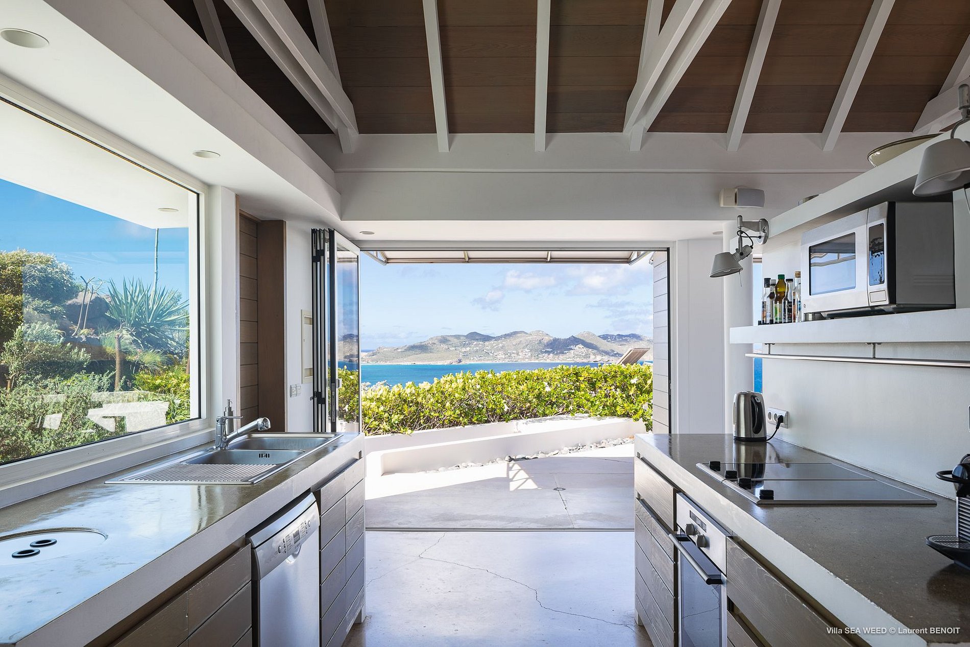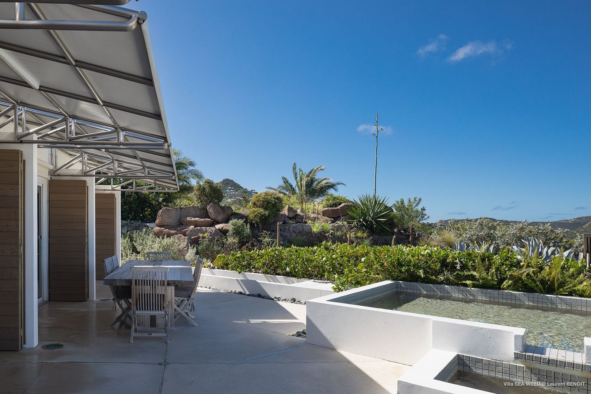 Na crista do monte que encabeça o exclusivo bairro de Pointe Milou, Villa Seaweed expressa-se em desenhos únicos e bem planejados em todos os sentidos possíveis: paisagismo, arquitetura e decoração. O caminho para a casa é acompanhado por um mar de plantas aquáticas e arbustos reminiscentes de uma casa no Hamptons - apenas o agave azul gigante ao lado da casa lembra que se está no Caribe. Uma vez dentro da casa, você é recebido pela visão acolhedora da piscina aquecida de três níveis durante todo o ano, um deck de madeira em meio a um misto de bougainvilles roxos e um amplo gramado verde. A vista para a ilha de St. Maarten torna este o ponto de vista perfeito para o pôr do sol.