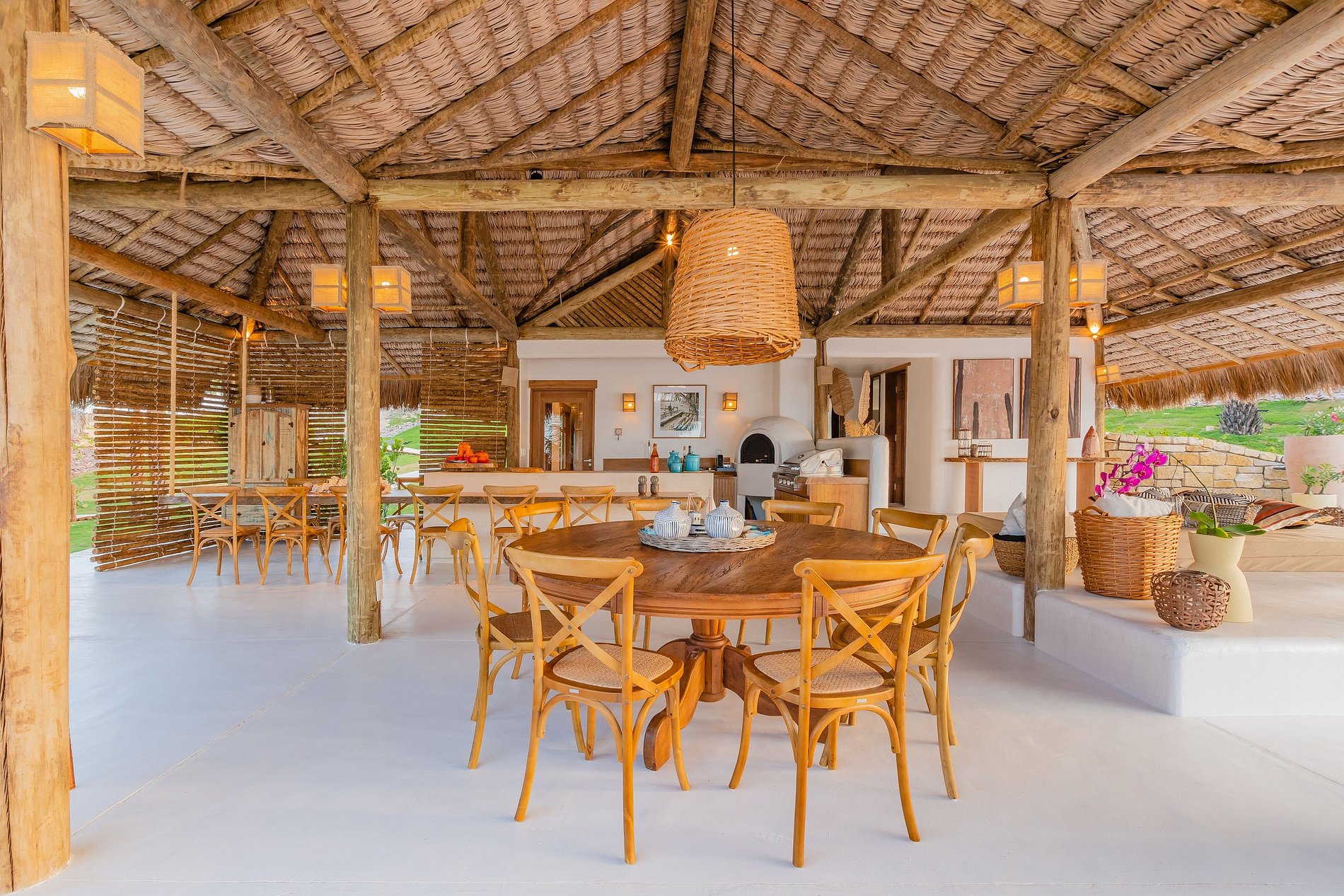 Amplo deck projetado em uma belíssima estrutura rústica, lounge de praia, churrasqueira profissional, forno de pizza a lenha, máquina de gelo, sistema de som com caixas na área externa, cozinha industrial completa, escritório, kids friendly, heliponto e guarderia.