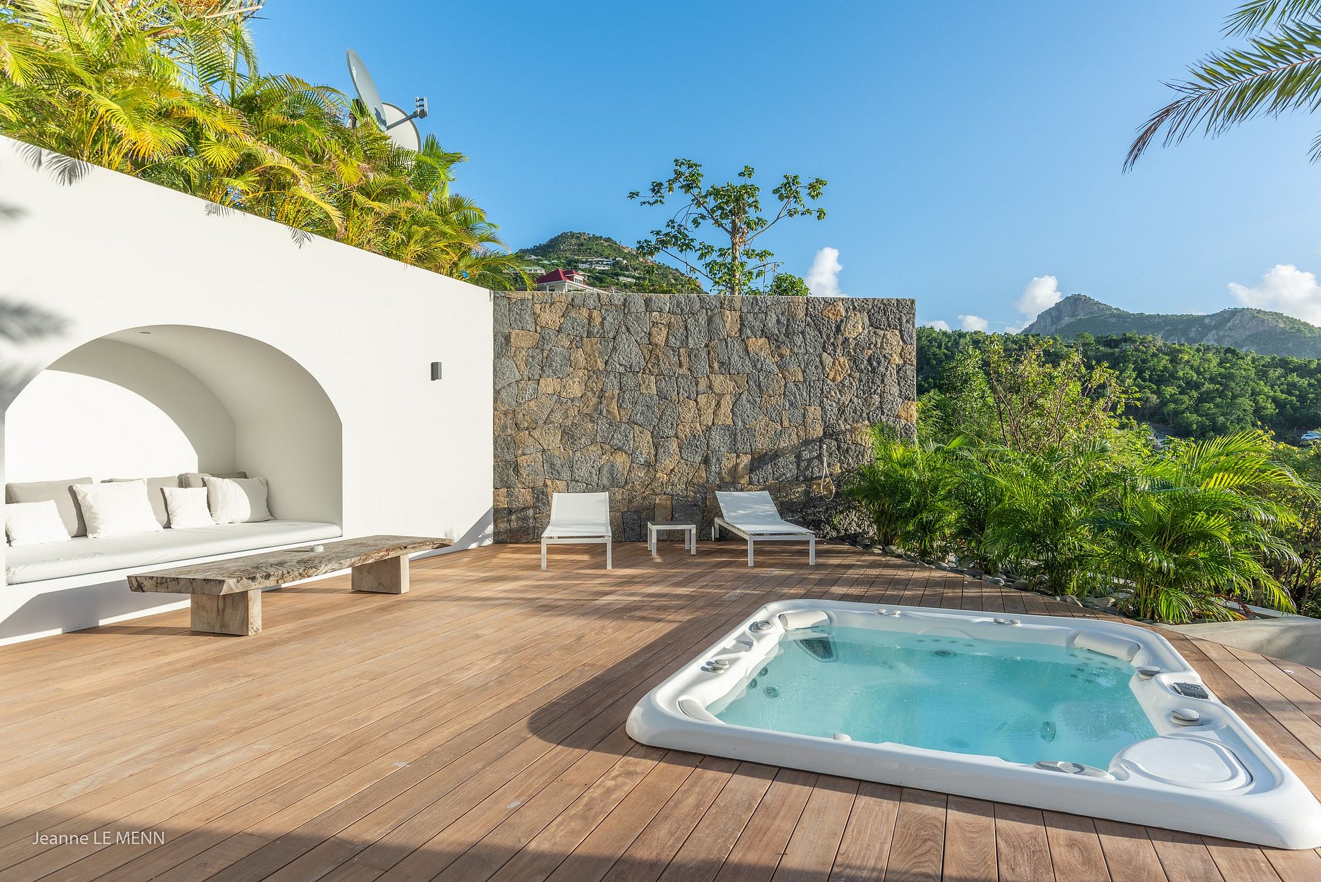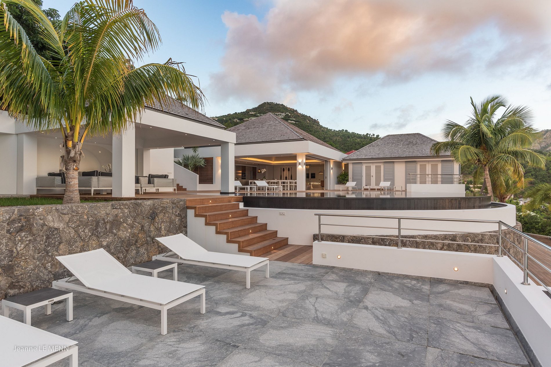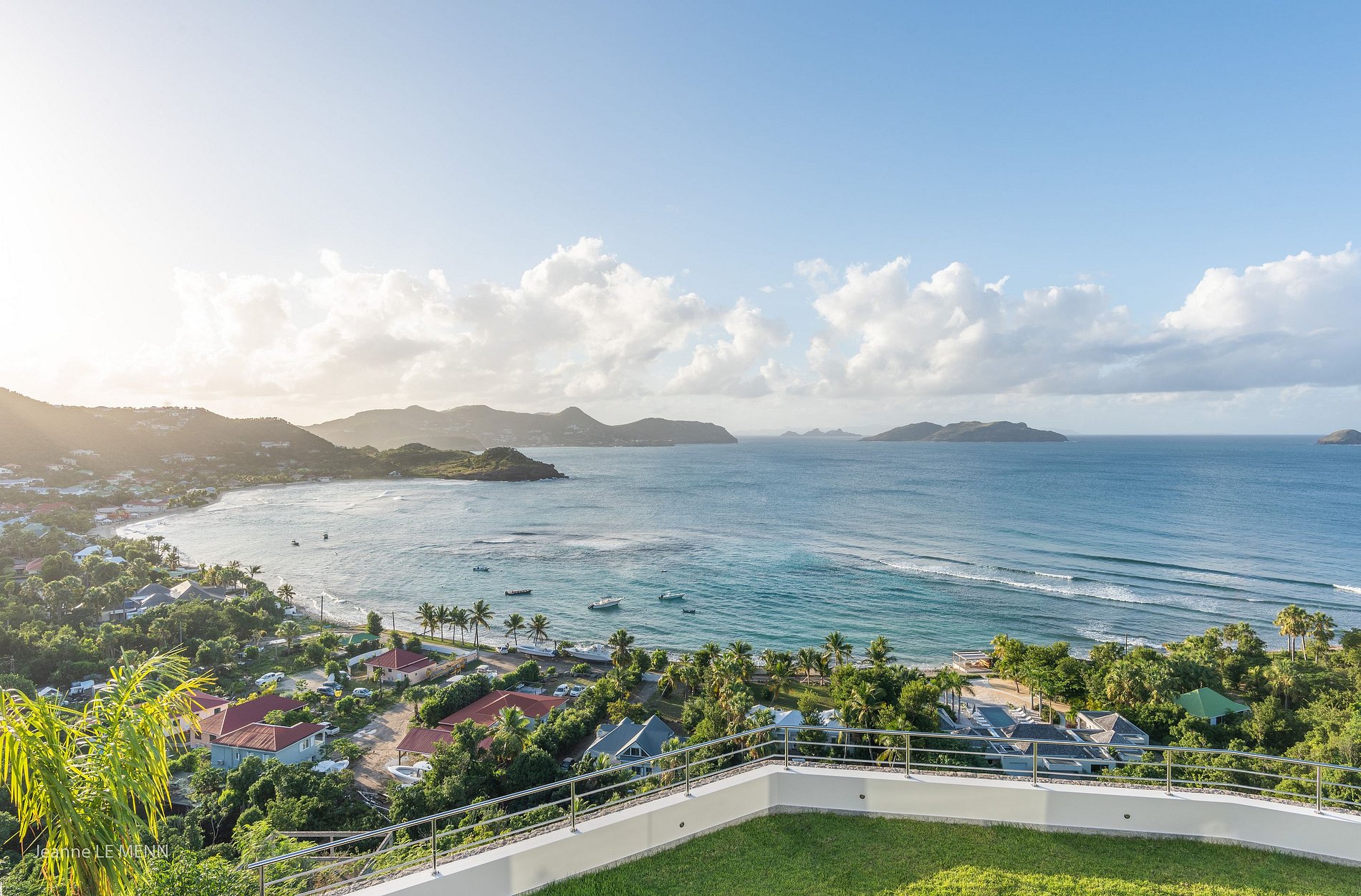 Desça as escadas para o deck e aprecie a vista expansiva de Lorient Bay e as ilhas. A poucos passos à sua esquerda, você está na cozinha moderna e totalmente equipada, com bancada em pedra preta e uma espaçosa geladeira Liebherr. A cozinha da Vila COCO PALMS abre diretamente para uma sala de estar confortável com uma televisão, e além disso, uma área de jantar com capacidade para dez pessoas. Mas se você está procurando o melhor ponto de vantagem para relaxar e ver o sol poente, vire à direita e você vai encontrar uma alcova almofadada com a visão perfeita, cercado com lugares sentados para oito, se você sentir vontade de compartilhar o momento. Estendendo-se até a borda da propriedade, um gramado verde convida você para mover uma das cadeiras de praia sob os galhos de uma árvore flamboyant.