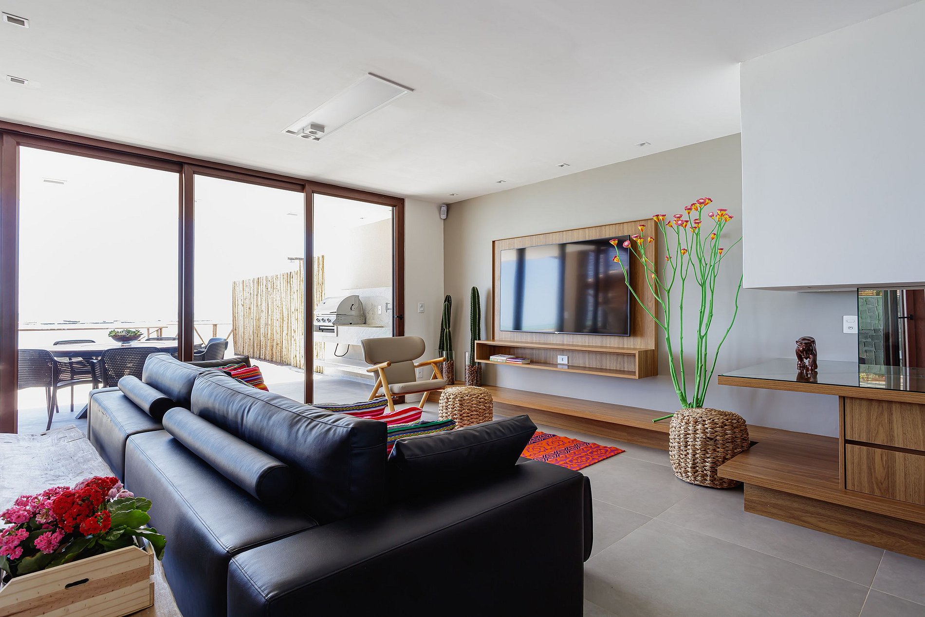 As salas dispõem de uma mesa de jantar, sofás e uma televisão smart para entretenimento familiar.