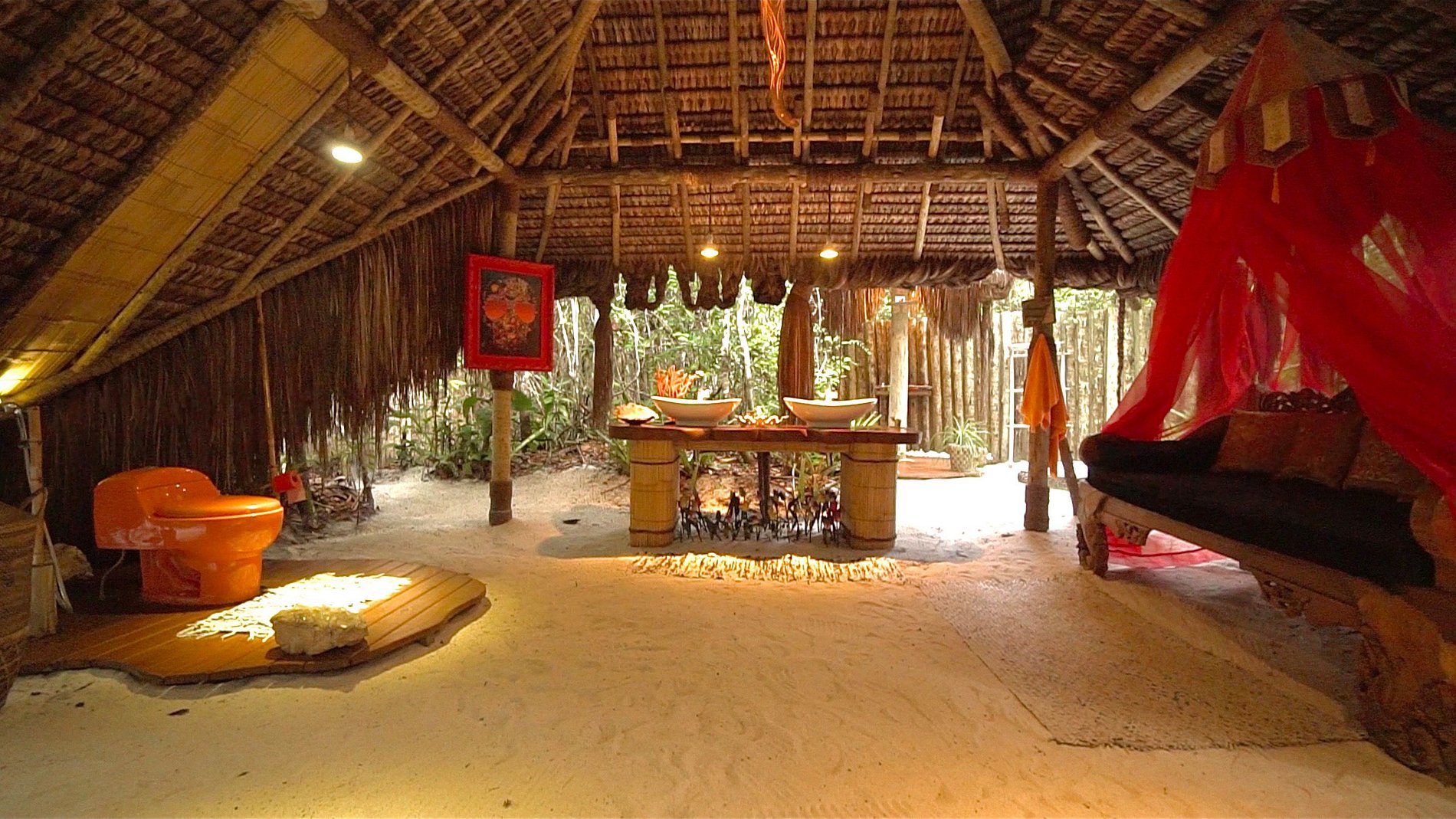 São 15 ambientes orgânicos, vestidos com 60km de corda de piaçava, distribuídos nos 21 mil metros de restinga, adaptados à própria natureza, o que faz com que nos sintamos integrados nela.