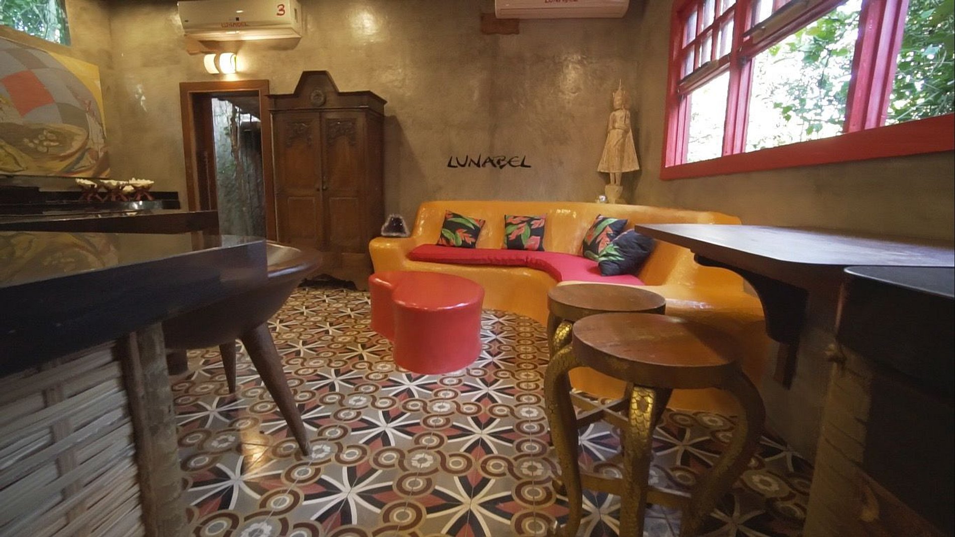 Lounge com Buda e almofadas para descansar com a companhia da natureza;
