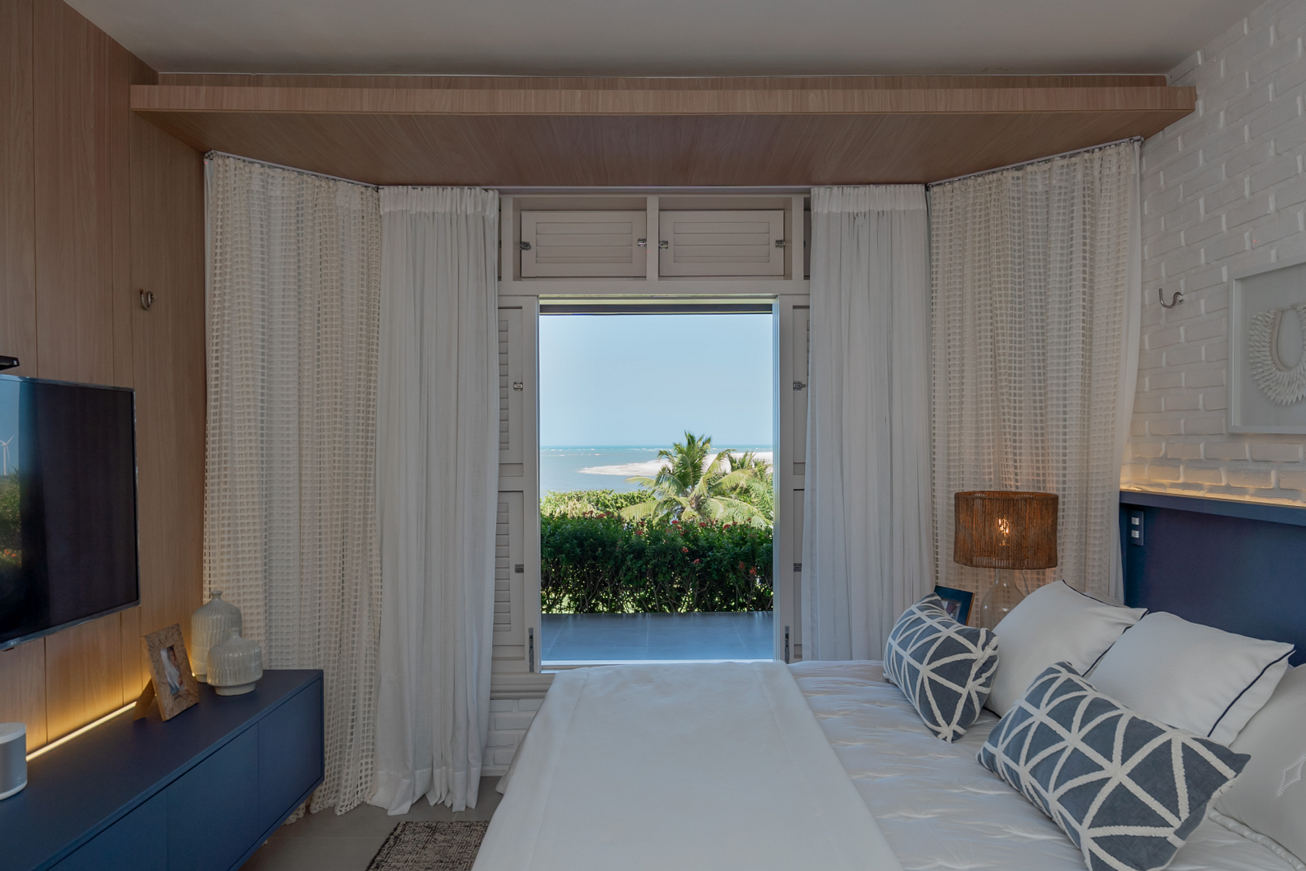 Com uma bela decoração, esta Vila pé na areia possui sete suítes, piscina com vista para o mar, quadra poliesportiva e apoio na areia, com cadeiras e mesas.