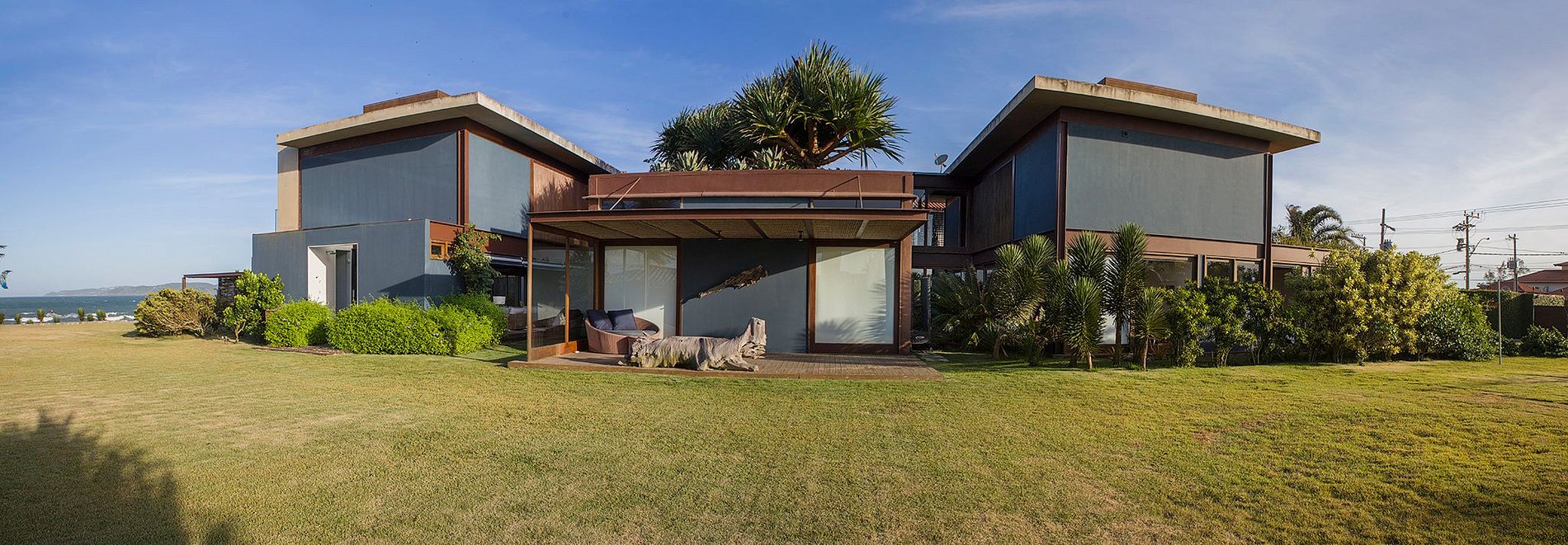 A área externa oferece um gazebo construído de bambu com vista panorâmica do mar, próximos a lindos coqueiros remetendo a região Nordeste do país. Amplo jardim que pode ser usado como campo de futebol, vôlei, etc e sauna a vapor com vista para o mar, completam a área externa.