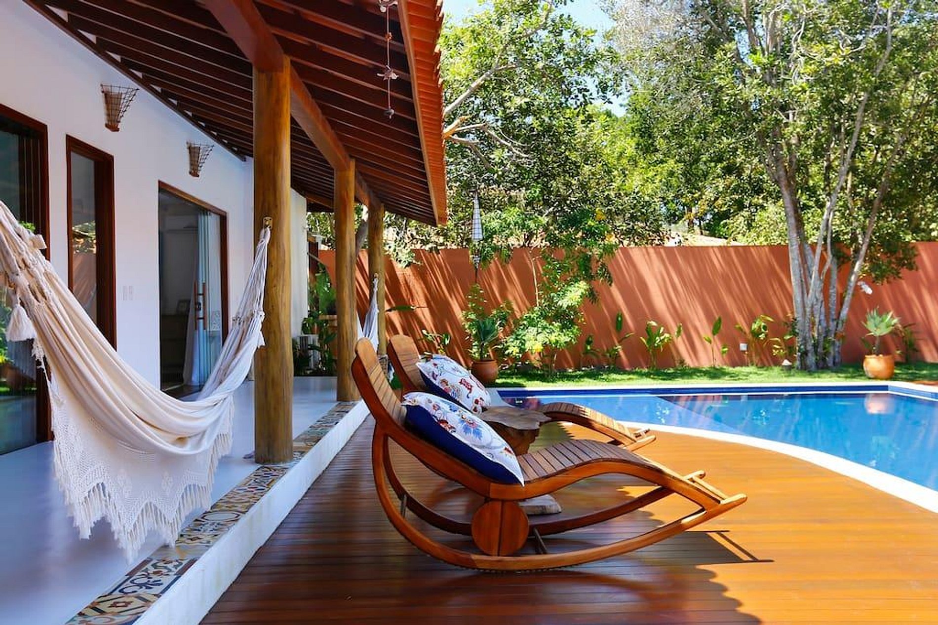 Duas casas distintas unidas por uma piscina ao meio. Essas duas casas são o fruto de uma grande história de amor dos proprietários nos últimos dez anos. A paixão que eles têm por essa casa tão especial fica clara logo que você chega lá. Cada detalhe foi escolhido para inspirar relaxamento, paz e conveniência. A maioria dos eletrodomésticos são importados e os objetos de arte foram escolhidos pessoalmente pelos donos para que sejam um reflexo de sua jornada juntos. Eles têm cinco filhos, então um dos requisitos era espaço, e parte da ideia era poder dar uma folga às crianças, deixando que elas ficassem em uma das casas e os pais na outra. A piscina fica no meio das casas, também existe uma churrasqueira e uma área para cozinhar do lado de fora.