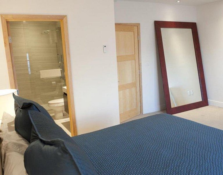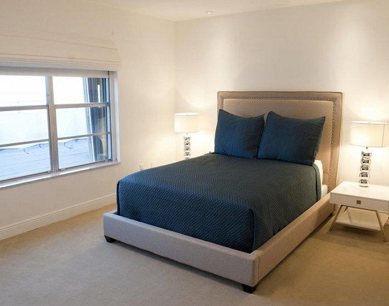O quarto principal tem uma cama king-size e um tapete de pelúcia. O banheiro principal é quase um cômodo completo por si só, com um espelho de maquiagem, banheira e todos os itens essenciais. Um walk-in closet, adjacente ao quarto principal, tem espaço suficiente para todos os seus pertences. O segundo quarto tem uma cama queen-size, um armário walk-in e mais carpete de pelúcia.