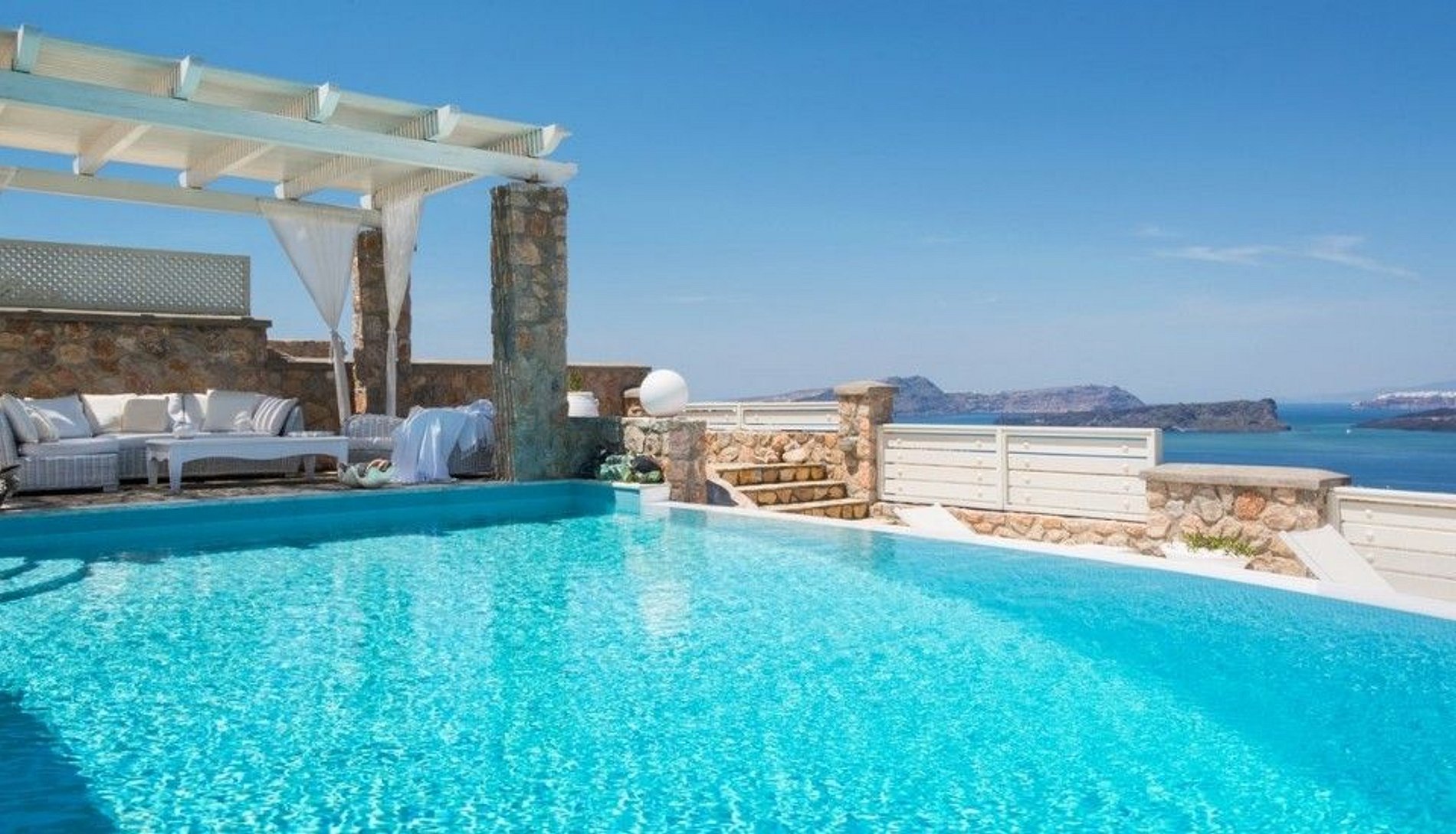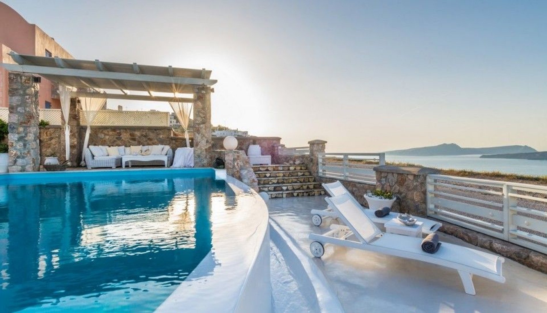 A Villa Michaela possui 5 quartos e vistas deslumbrantes do vulcão de Santorini e do mar.